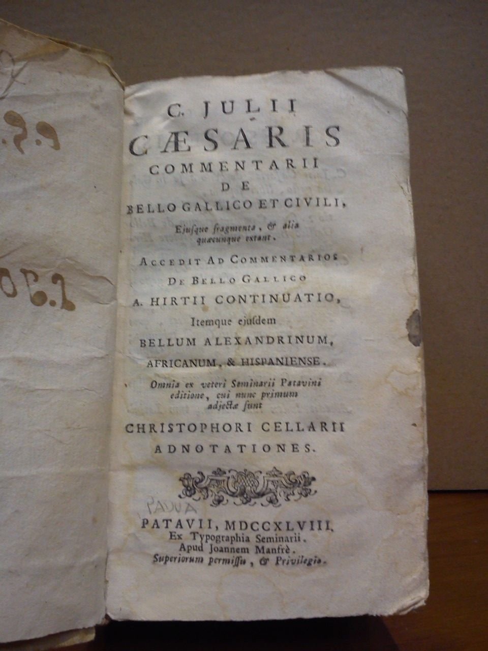 Commentarii de Bello Gallico et Civili, Eiusque fragmenta, et alia quaecunque extant / Accedit Ad Commentarios De Bello Gallico A. hirtii continuatio, Itemque ejusdem Bellum Alexandrinum, Africanum. & Hispaniense. Omnia ex veteri Seminarii Patavini editione, cui nunc primum adjectae sunt, Christophori Cellarii adnotationes
