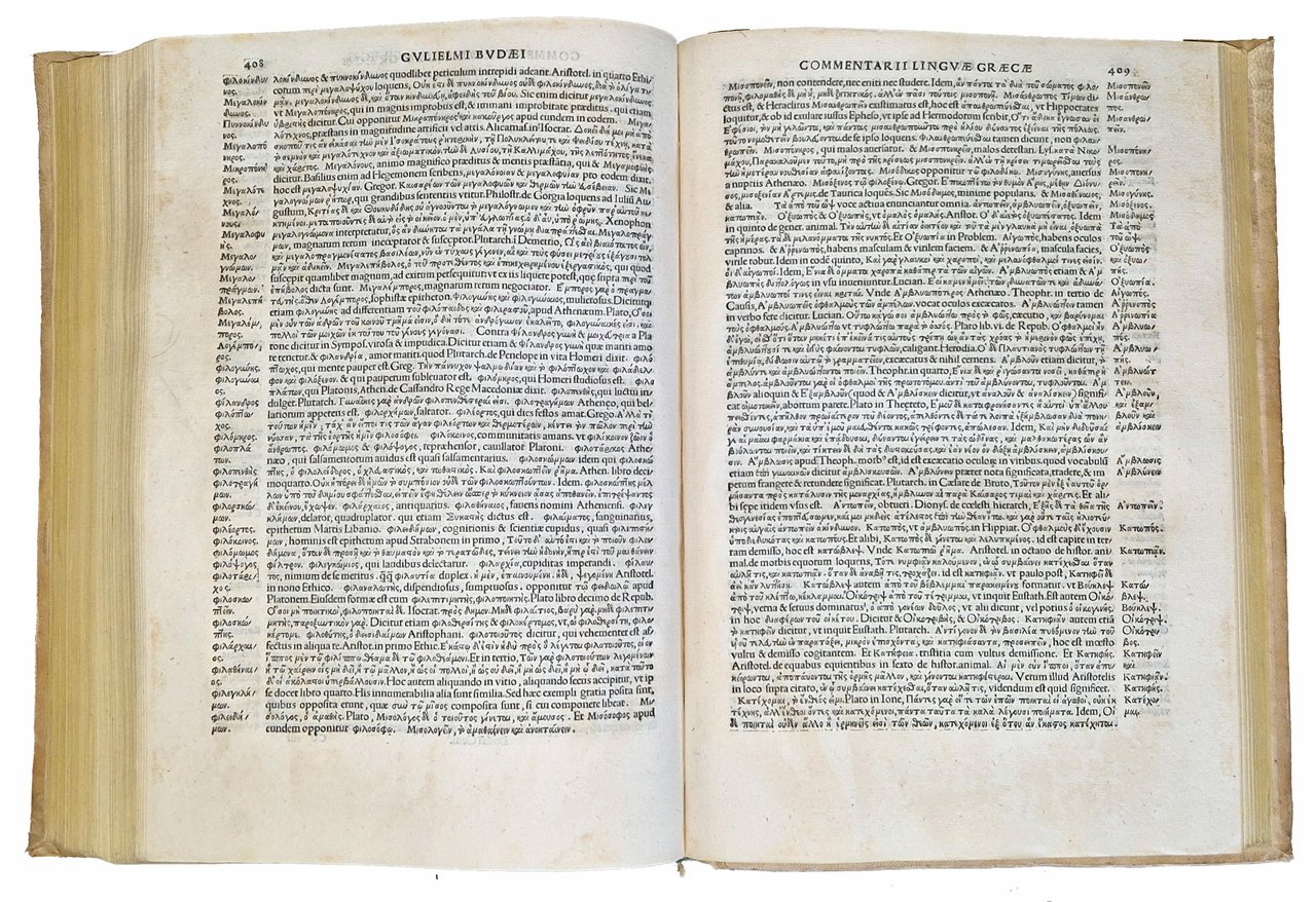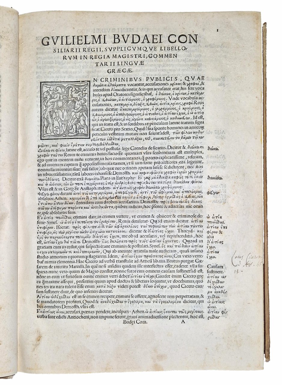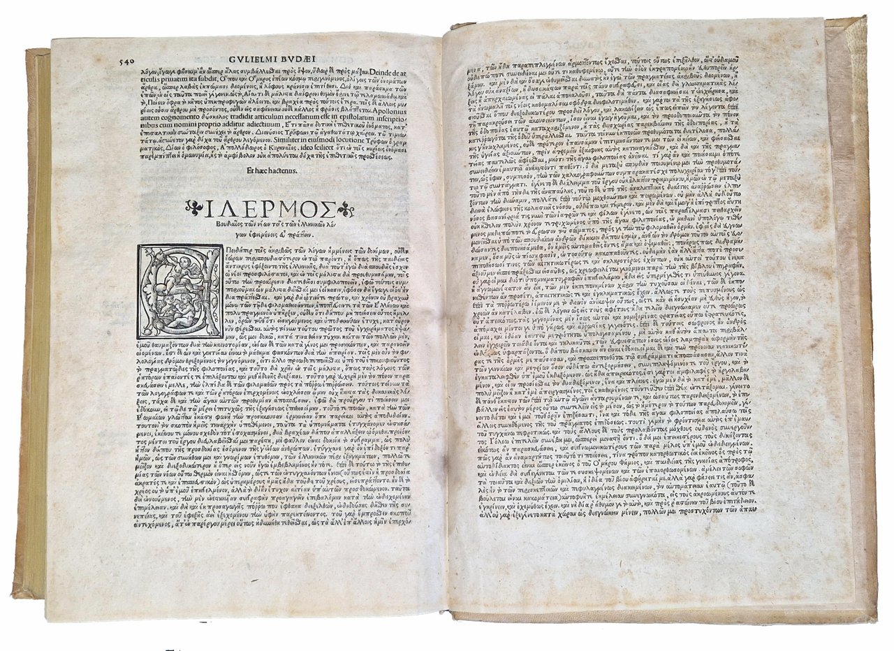 in-folio, 308x208 mm, leg. in piena pergamena rigida, con preziose impressioni ai piatti, sei nervi al dorso, titolo a caratteri dorati su tassello al dorso, tagli colorati di giallo; pp. [44], 540, [4]. Marca giuntina xilografata al frontespizio e al colophon [Giglio fiorentino; iniziali LA]. Testo in corsivo, greco e romano. Prefazione in greco, indici in greco e in latino. Iniziali xilografiche. Al colophon: Venetiis in aedibus Lucae Antonii Iuntae Florentini anno Domini 1530 sexto Kalen. octobris. Prima edizione veneziana, finemente stampata dalla tipografia Giunta, di questa vasta raccolta di note lessicografiche, un contributo unico agli studi rinascimentali sulla letteratura greca, pubblicata per la prima volta l'anno precedente a Parigi. Gauillaume Budé (Budaeus, Gulielmus -1467-1540), filologo ellenista francese, compilò originariamente quest'opera su richiesta di Erasmo, l'altro grande studioso umanista dell'epoca, per la preparazione di un dizionario greco. Aggiunse un'introduzione in greco e dedicò la sua opera al re Francesco I, ricordando la sua promessa di fondare una scuola per lo studio delle lingue antiche. Il Collegium Trilingue (in seguito, Collège de France) fu debitamente inaugurato nel 1530, anno di pubblicazione della presente edizione. "I 'Commentari sulla lingua greca' costituirono la base per lo studio della lingua greca in Francia. un monumento del nuovo sapere". Prov.: Presenza di due antichi timbri nobiliari d'appartenenza al frontespizio. Antica iscrizione d'appartenenza manoscritta al frontespizio, non leggibile. Altro timbro d'appartenenza ad inchiostro nero al contropiatto anteriore [Biblioteca Ulrico Pannuti]. Ulrico Pannuti (1928-2006) è stato uno scrittore, appassionato di archeologia e filologia. Etichetta di provenienza incollata al contropiatto anteriore, su carta lucida, moderna e a colori (Ex libris Francesco Mattioli). Il prof. Francesco Mattioli, nato nel 1947, viterbese, già ordinario di sociologia presso l'Università La Sapienza di Roma, è il fondatore della sociologia visuale italiana. Rif.: IT\ICCU\CNCE\007798. CNCE 7798. OCLC, 875155570. Cond.: Lievi tracce d'uso alla legatura (presenza di alcuni forellini di tarlo in corrispondenza del dorso; piccola macchia al taglio inferiore delle carte). Carte abbastanza pulite con occasionali macchie e rare fioriture. Esemplare in condizioni generali decisamente molto buone.