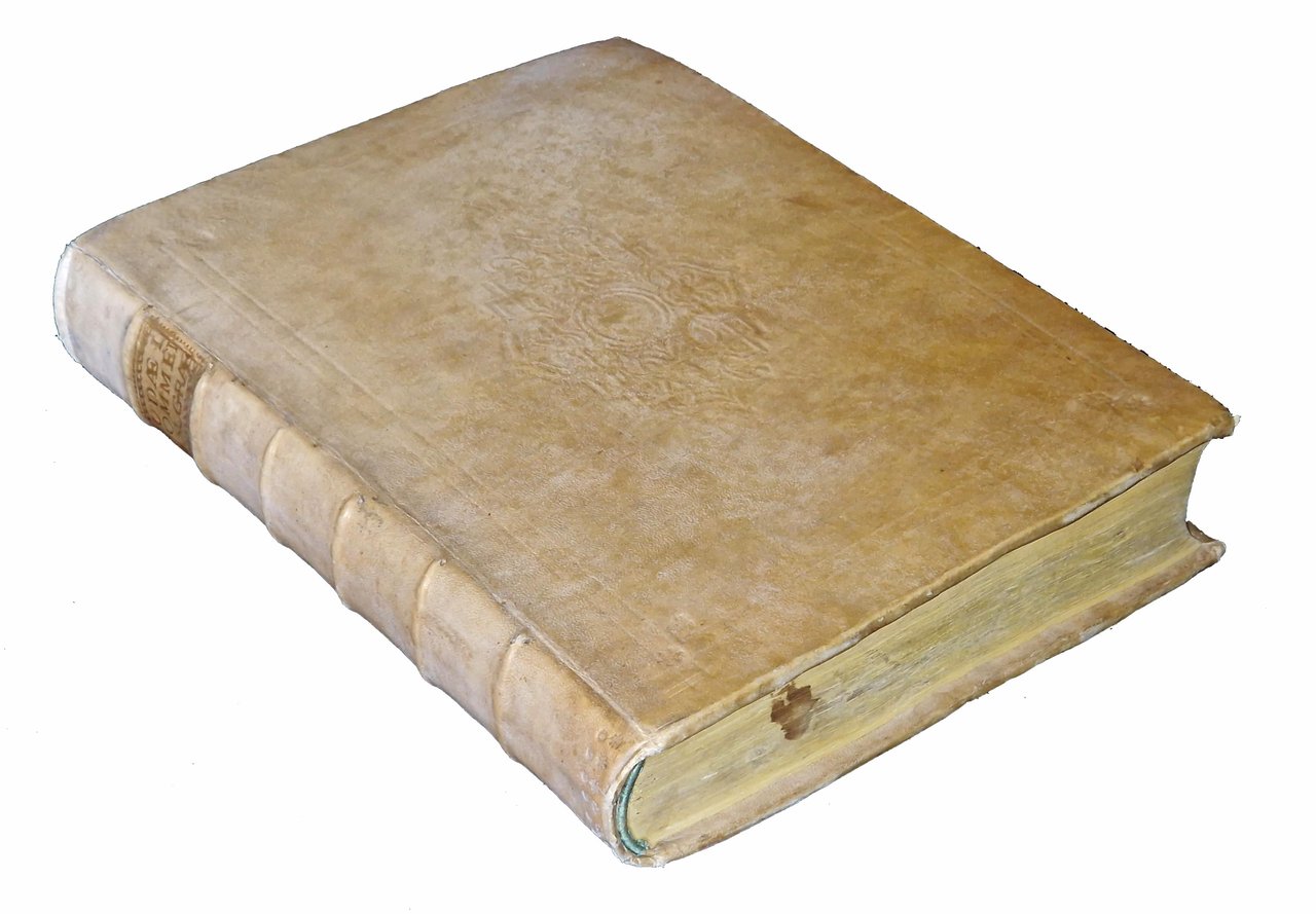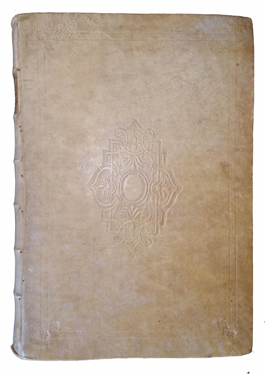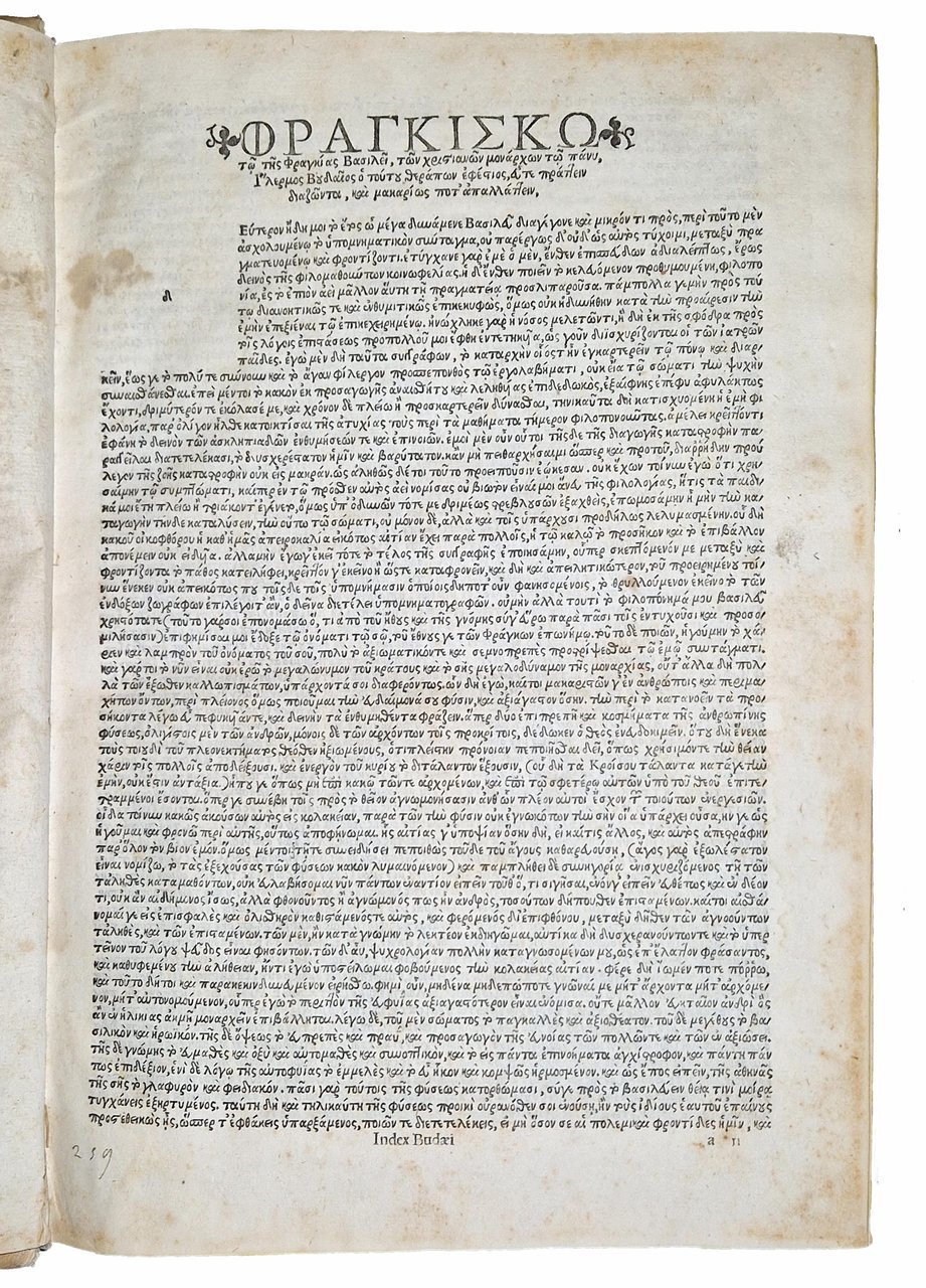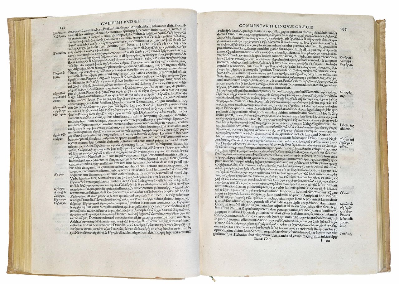 in-folio, 308x208 mm, leg. in piena pergamena rigida, con preziose impressioni ai piatti, sei nervi al dorso, titolo a caratteri dorati su tassello al dorso, tagli colorati di giallo; pp. [44], 540, [4]. Marca giuntina xilografata al frontespizio e al colophon [Giglio fiorentino; iniziali LA]. Testo in corsivo, greco e romano. Prefazione in greco, indici in greco e in latino. Iniziali xilografiche. Al colophon: Venetiis in aedibus Lucae Antonii Iuntae Florentini anno Domini 1530 sexto Kalen. octobris. Prima edizione veneziana, finemente stampata dalla tipografia Giunta, di questa vasta raccolta di note lessicografiche, un contributo unico agli studi rinascimentali sulla letteratura greca, pubblicata per la prima volta l'anno precedente a Parigi. Gauillaume Budé (Budaeus, Gulielmus -1467-1540), filologo ellenista francese, compilò originariamente quest'opera su richiesta di Erasmo, l'altro grande studioso umanista dell'epoca, per la preparazione di un dizionario greco. Aggiunse un'introduzione in greco e dedicò la sua opera al re Francesco I, ricordando la sua promessa di fondare una scuola per lo studio delle lingue antiche. Il Collegium Trilingue (in seguito, Collège de France) fu debitamente inaugurato nel 1530, anno di pubblicazione della presente edizione. "I 'Commentari sulla lingua greca' costituirono la base per lo studio della lingua greca in Francia. un monumento del nuovo sapere". Prov.: Presenza di due antichi timbri nobiliari d'appartenenza al frontespizio. Antica iscrizione d'appartenenza manoscritta al frontespizio, non leggibile. Altro timbro d'appartenenza ad inchiostro nero al contropiatto anteriore [Biblioteca Ulrico Pannuti]. Ulrico Pannuti (1928-2006) è stato uno scrittore, appassionato di archeologia e filologia. Etichetta di provenienza incollata al contropiatto anteriore, su carta lucida, moderna e a colori (Ex libris Francesco Mattioli). Il prof. Francesco Mattioli, nato nel 1947, viterbese, già ordinario di sociologia presso l'Università La Sapienza di Roma, è il fondatore della sociologia visuale italiana. Rif.: IT\ICCU\CNCE\007798. CNCE 7798. OCLC, 875155570. Cond.: Lievi tracce d'uso alla legatura (presenza di alcuni forellini di tarlo in corrispondenza del dorso; piccola macchia al taglio inferiore delle carte). Carte abbastanza pulite con occasionali macchie e rare fioriture. Esemplare in condizioni generali decisamente molto buone.