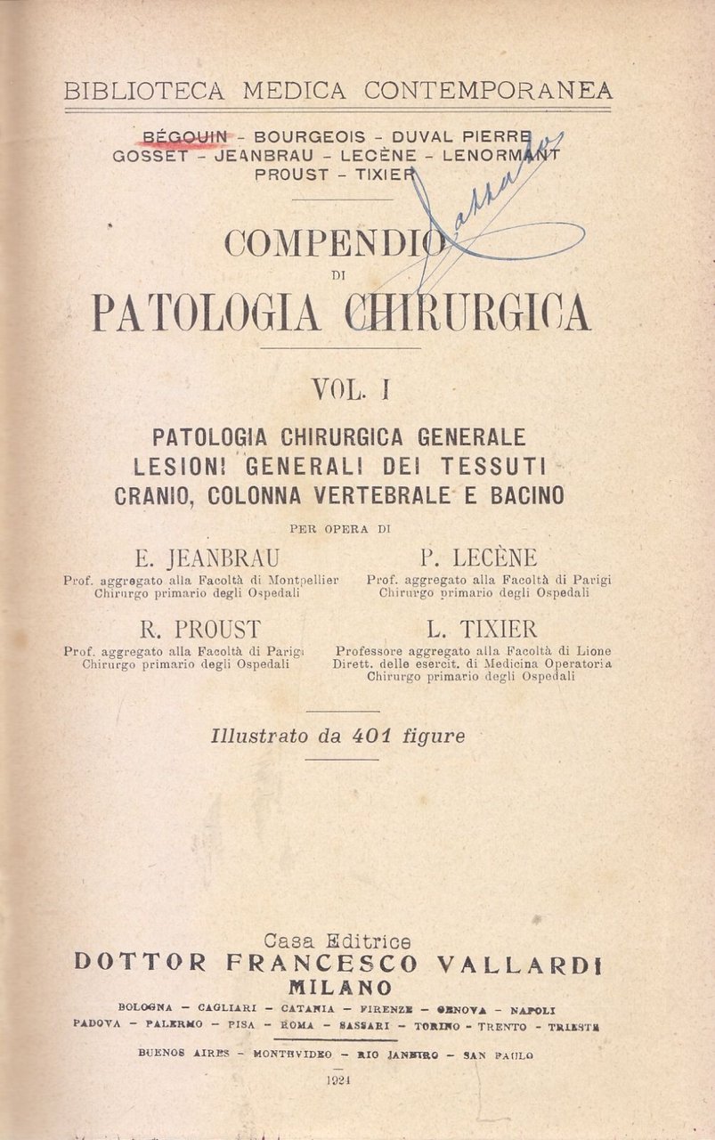 Volume I: Patologia Chirurgica Generale, Lesioni generali dei tessuti, Cranio, Colonna Vertebrale e Bacino. Volume II: Testa, Collo, torace Volume III: glandole mammarie, addome, apparato genitale maschile. Volume IV: Apparato Orinario, apparato genitale femminile, arti.