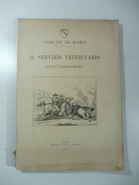 In 4 (cm 21,5 x 31), pp. X + 230 con tabelle e foto in bianco/nero intercalate al testo. Brossura editoriale con danno riparato al dorso. Relazione statistica, sanitaria e zootecnica relativa al servizio veterinario nel comune di Roma fra 1908 e 1913. Fra gli argomenti: Servizio veterinario; Stabilimento di mattazione; Mattatoio di Porta del Popolo; Campo Boario; Relazione statistica-zootecnica sul bestiame condotto al Campo Boario; Trasporto della carne macellata; Frigorifero, Ispezione delle derrate alimentari allo Scalo ferroviario di Termini; ecc.