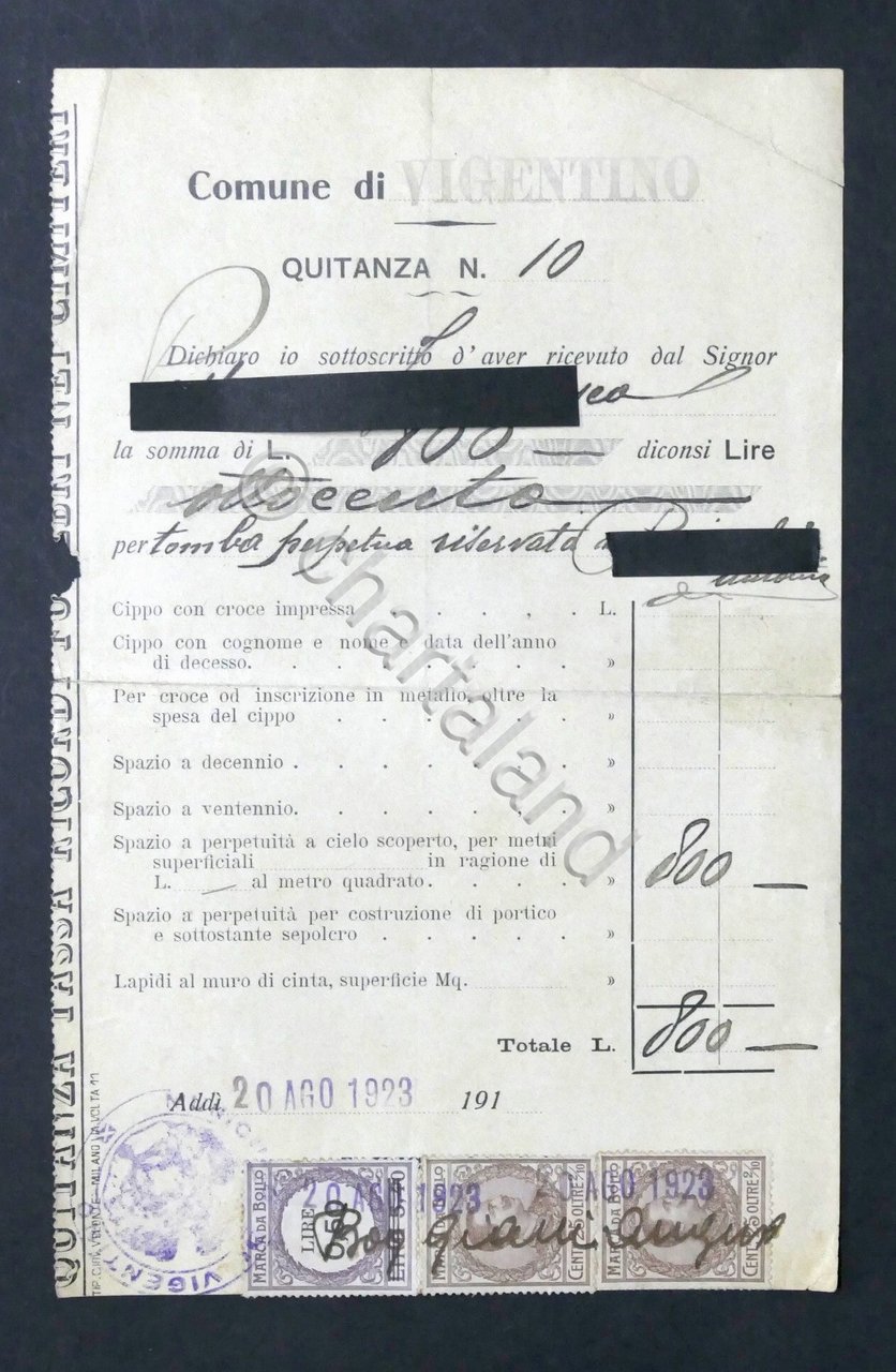 Comune di Vigentino (Milano) - Quietanza di Pagamento per tomba perpetua - 1923