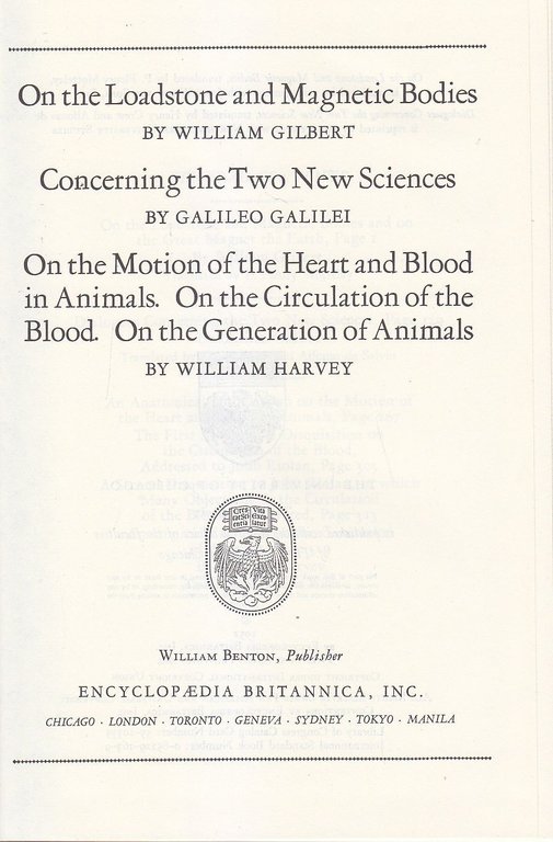 On the Loadstone and Magnetic Bodies di William Gilbert; Concerning the Two New Sciences di Galileo Galilei; On the Motion of the Heart and Blood in Animals, On the Circulation of the Blood, On the Generation of Animals di William Harvey.