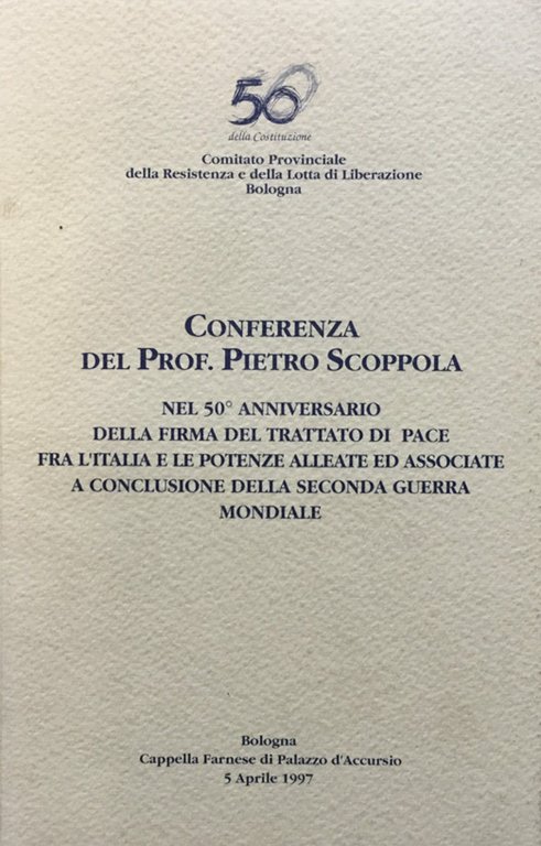 Conferenza del prof. Pietro Spinola nel 50^ anniversario della firma del trattato di pace fra Italia e le potenze alleate ed associate a conclusione della seconda guerra mondiale. Bologna, Comitato Provinciale della Resistenza e della Lotta di Liberazione di Bologna, 1997. Brossura- 35 pp., 21 cm. condizioni eccellenti 12 Ottimo (Fine) Ottimo