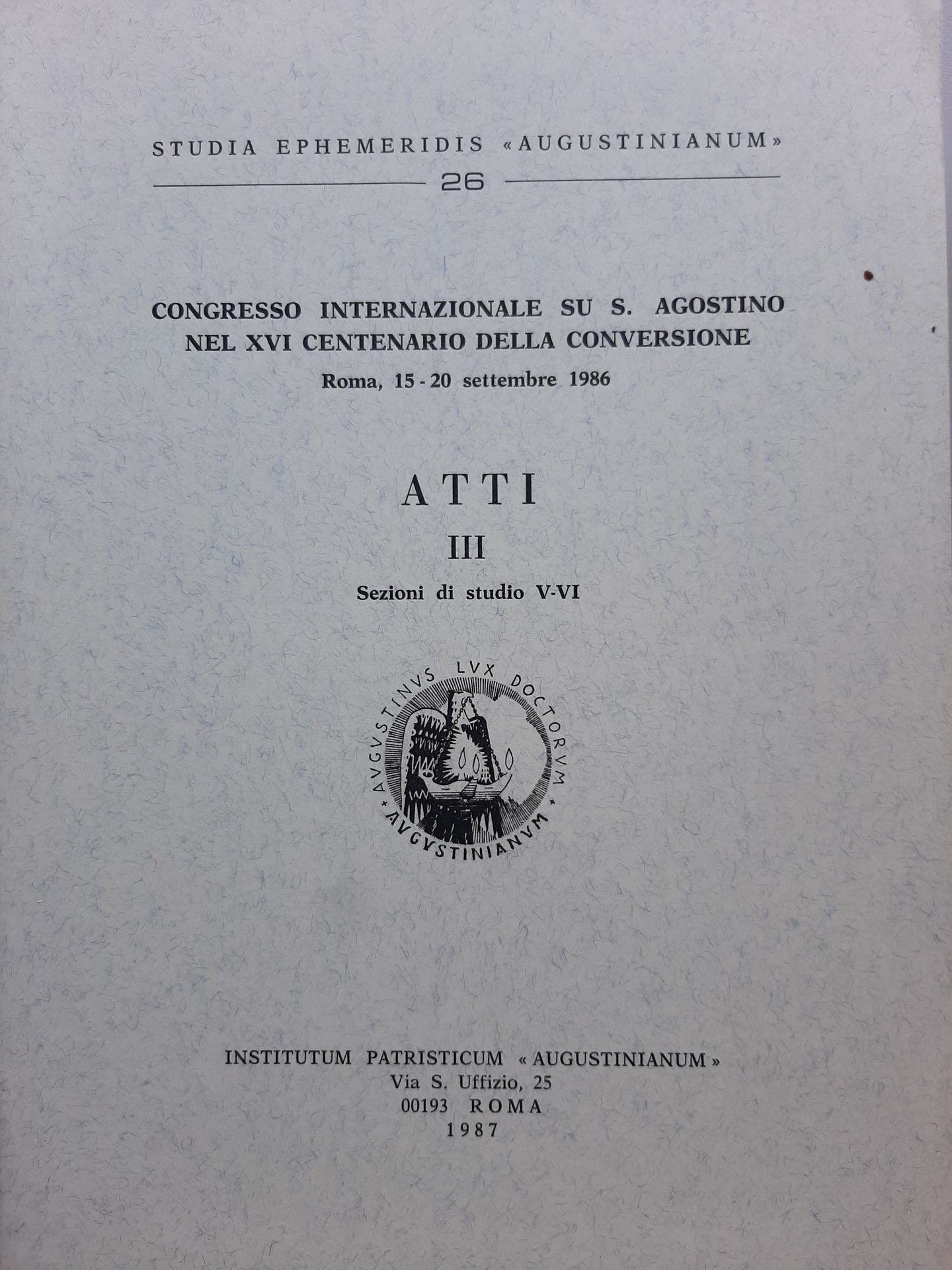 Congresso Internazionale su S. Agostino nel XVI centenario della conversione. Roma 15-20 Settembre 1986. Atti III. Sezioni di studio V-VI