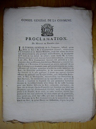 Conseil Général de la Commune. Proclamation du Mercredi 10 Novembre 1790 : "Le Conseil Général de la Commune, instruit qu'un Billet du Roi à M. le Commandant Général, relativement à la formation de se Maison Militaire, avoit fait naître des bruits qui demandoient les plus prompts éclaircissements, & des alarmes qu'il étoit de son devoir de calmer".