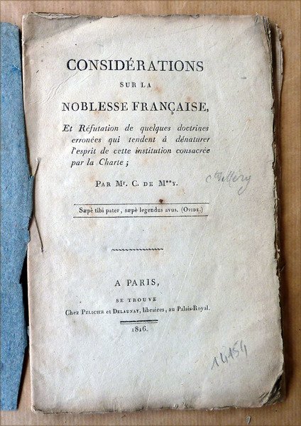 Un volume broché de format petit in 8° de 52 pp.; couverture en papier bleu fortement effrangée. Considérations philosophiques et historiques sur la suprématie naturelle de la Noblesse. Voir photo.