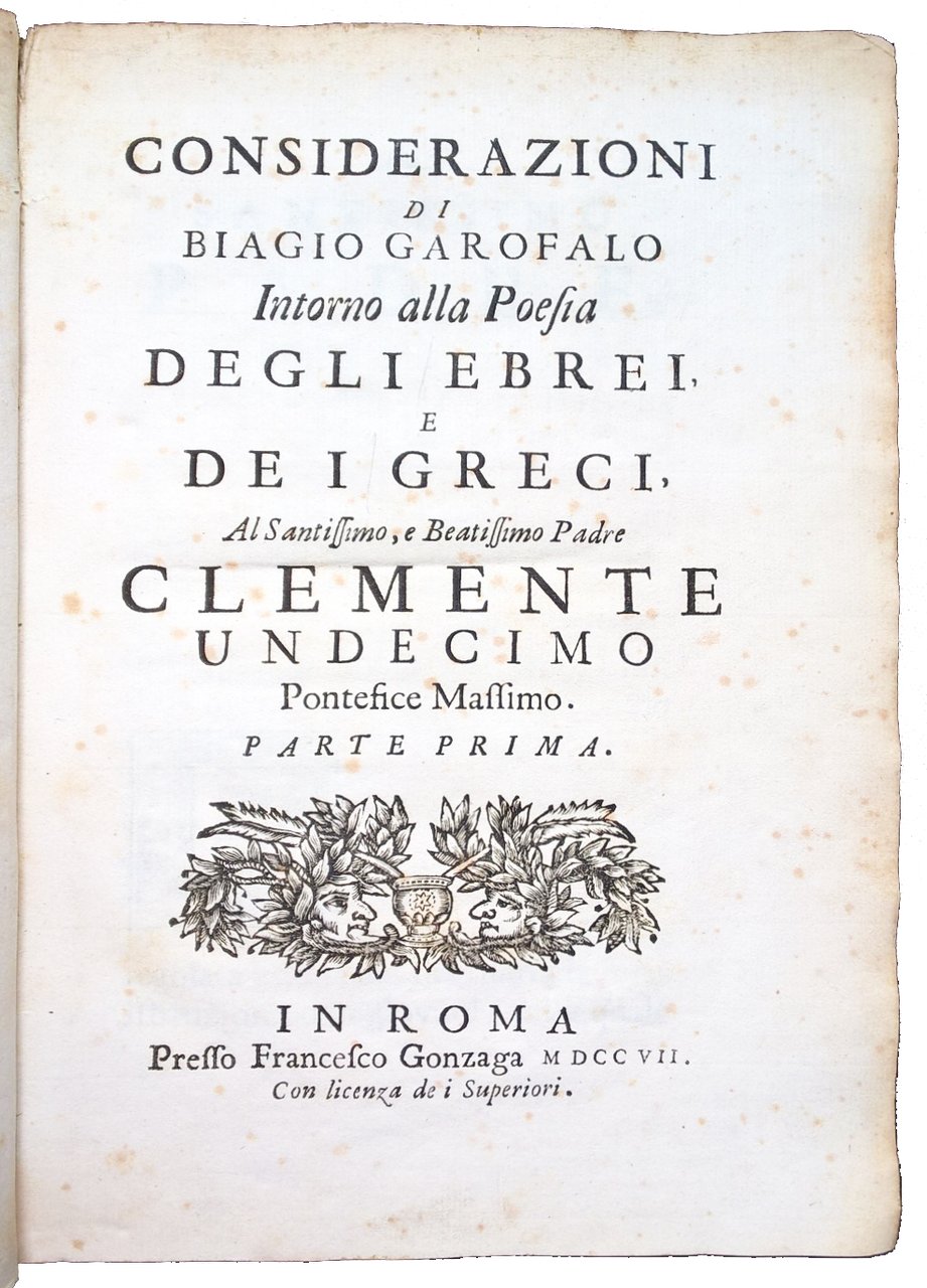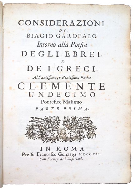 Considerazioni di Biagio Garofalo intorno alla poesia degli Ebrei, e de i Greci, . Parte prima. | Livres anciens et modernes | Garofalo, Biagio