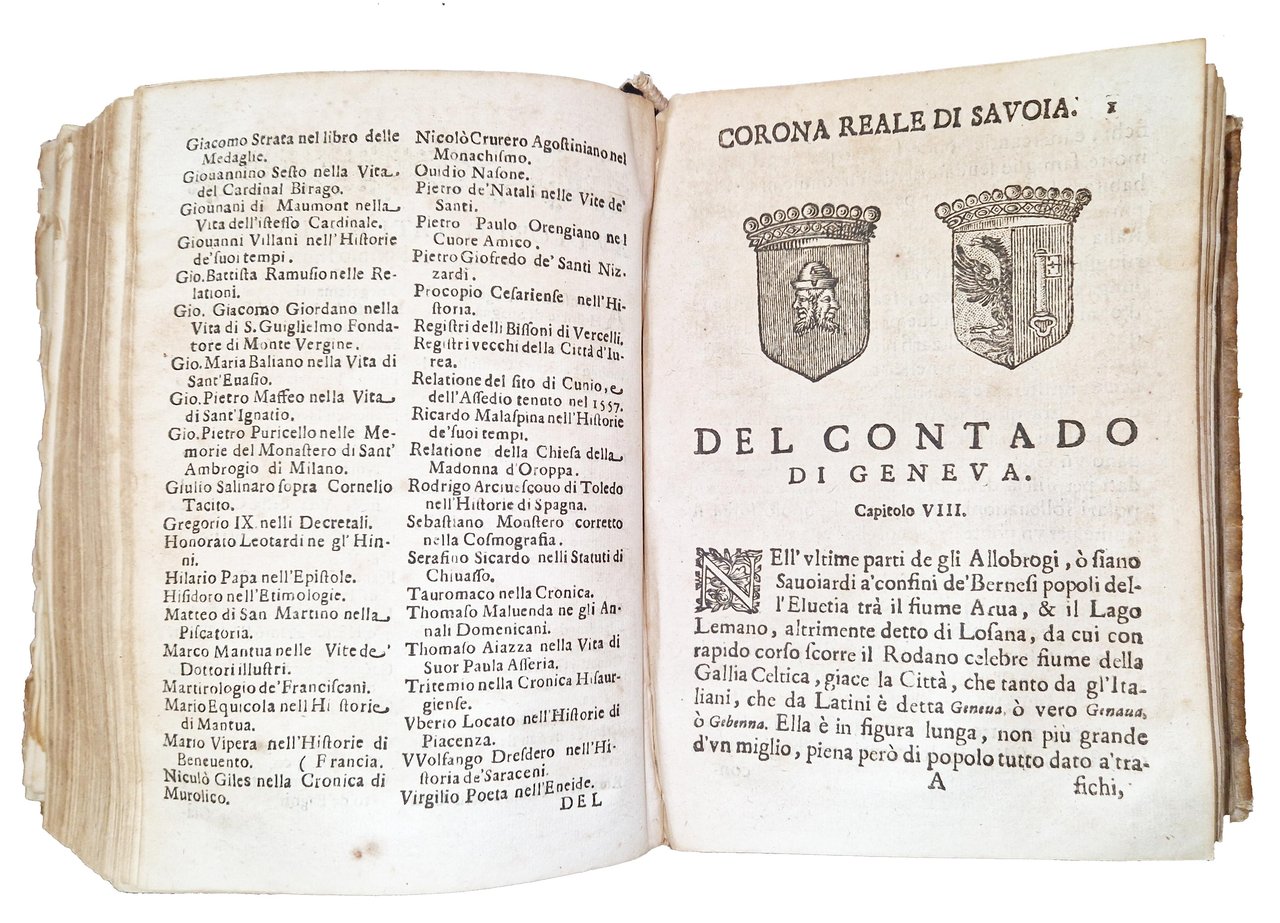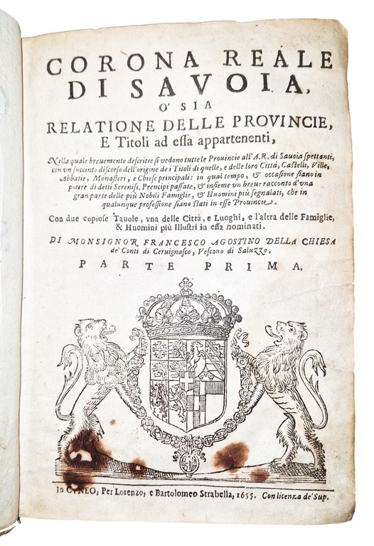 Corona reale di Savoia, o sia relatione delle provincie, e titoli ad essa appartenenti. Nella quale breuemente descritte si vedono tutte le provincie dell'A.R. di Savoia spettanti, con un succinto discorso dell'origine de i titoli di quelle, e delle loro citta, castelli, ville, abbatie, monasteri e chiese principali […]. Con due copiose tauole, una delle citta, e luoghi, e l'altra delle famiglie, & huomini piu illustri in essa nominati. Di monsignor Francesco Agostino Della Chiesa de' conti di Cervignasco, vescovo di Saluzzo. Parte prima [-seconda].