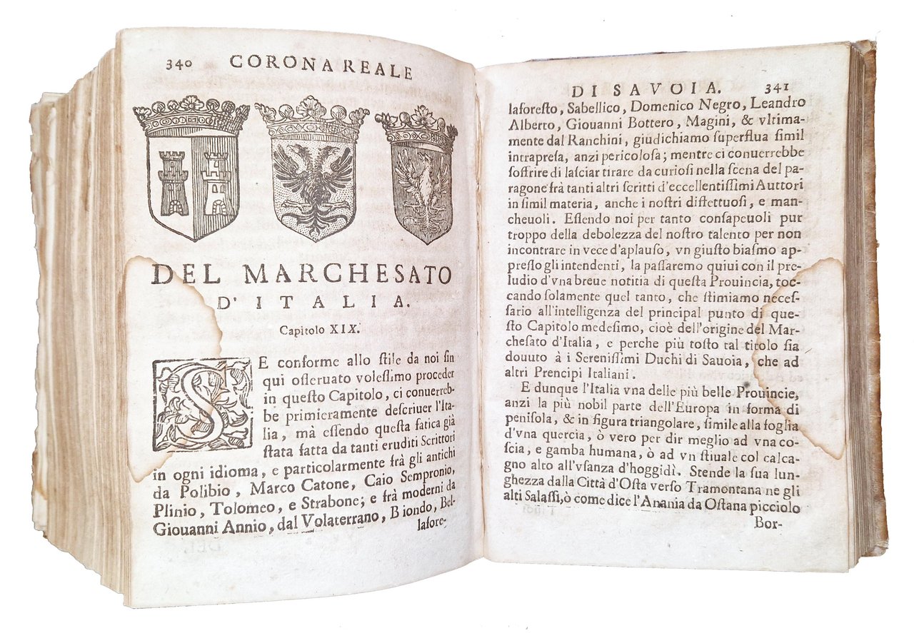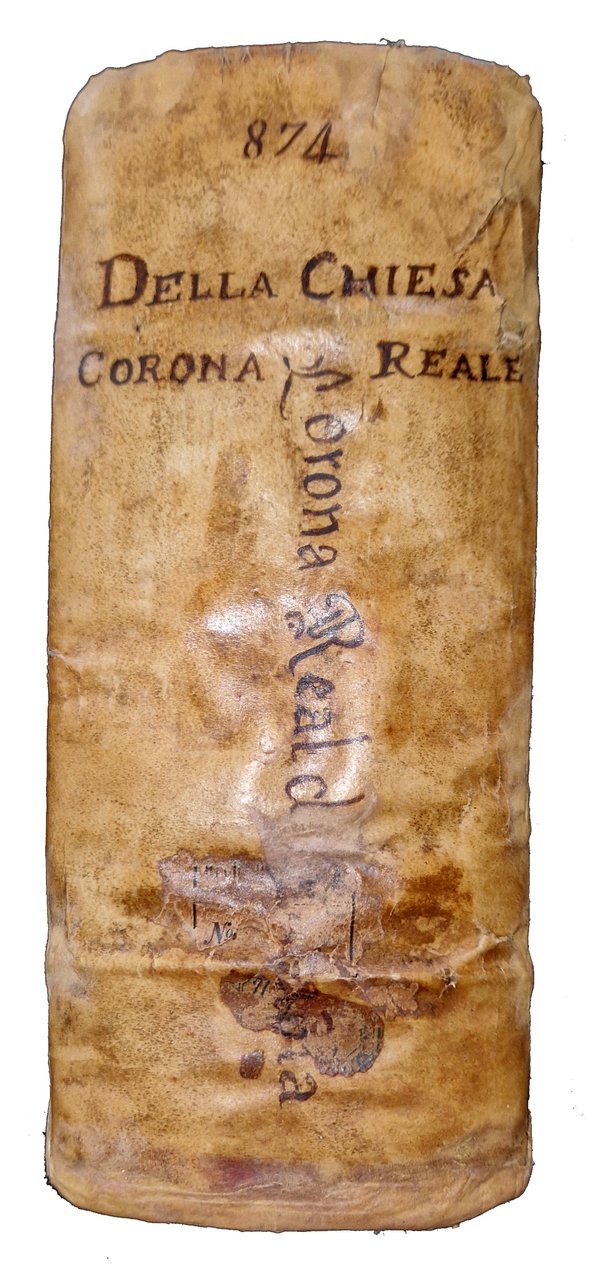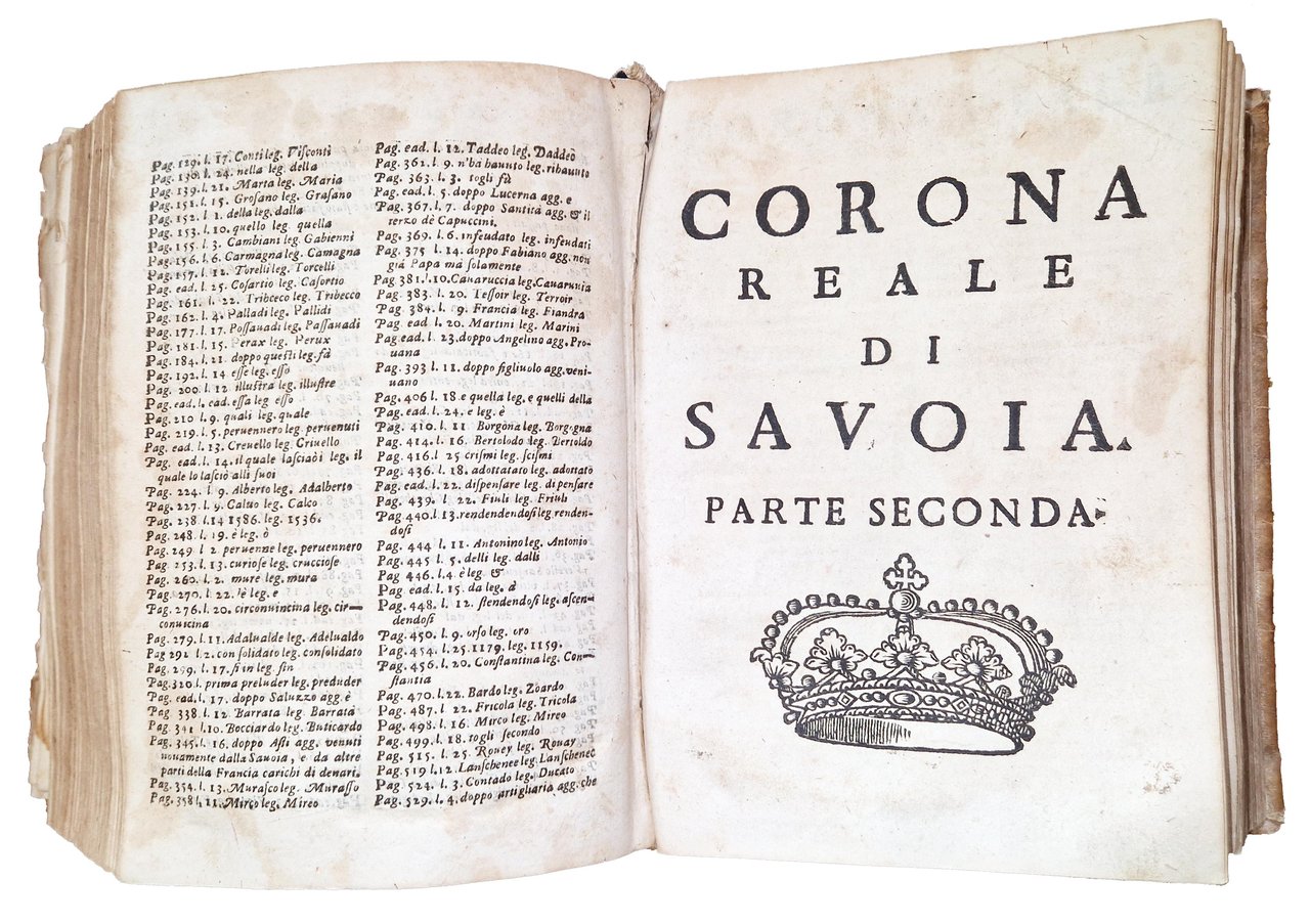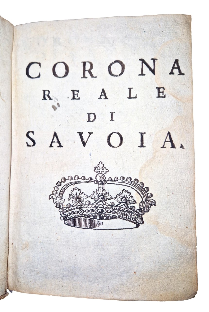 in-4°, 192x132 mm, leg. coeva in piena pergamena, con titolo calligrafato al dorso; due parti legate in un volume; pp. [46], 531, [37]; [16], 589, [47]. Fregio xilografico con corona su entrambi gli occhietti; stemma dei Savoia, coronato, sorretto da due leoni rampanti, xilografato sui frontespizi. Testatine, fregi e iniziali xilografiche. Un ritratto xilografico a mezza pagina dell'Autore al recto della quarta c. nn. Della seconda parte. Numerosi stemmi delle provincie sabaude in xilografia a m. pag. (35 stemmi di città e domini sabaudi e 2 stemmi vescovili). Titolo a entrambi gli occhietti: "Corona reale di Savoia". Alle carte [a]2r-[a]3r della prima parte lettera dedicatoria dell'Autore a Carlo Emanuele II, duca di Savoia. La seconda parte fu pubblicata nel 1657. Prima edizione di questa corposa e importante opera sulla storia piemontese dell'epoca; in essa l'autore riporta con grande dettaglio tutte le possibili informazioni sugli Stati governati dal principe Carlo Emanuele II (1634-1675), con l'intento di formare una "corona reale" da porre sul capo del sovrano. Il volume fu anche ripubblicato in una successiva edizione nel 1777. Francesco Agostino Della Chiesa (1593-1662) fu Vescovo di Saluzzo, storiografo, cosmografo e consigliere di Vittorio Amedeo I. Rif.: IT\ICCU\TO0E\001871. OCLC, 1360395235 e 1360405398. Vinciana, 979: "Opera importante per l'araldica sia per le notizie sia per le incisioni delle principali famiglie piemontesi". Cond.: Tracce d'uso alla legatura (macchia al dorso, in corrispondenza del titolo calligrafato). Lentezza della legatura di alcune carte. Carte in generale abbastanza pulite, occasionali bruniture, presenza di gore d'umido al margine esterno di alcune delle prime 30 carte della prima parte. Esemplare in buone condizioni generali.