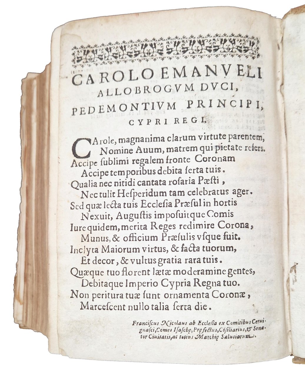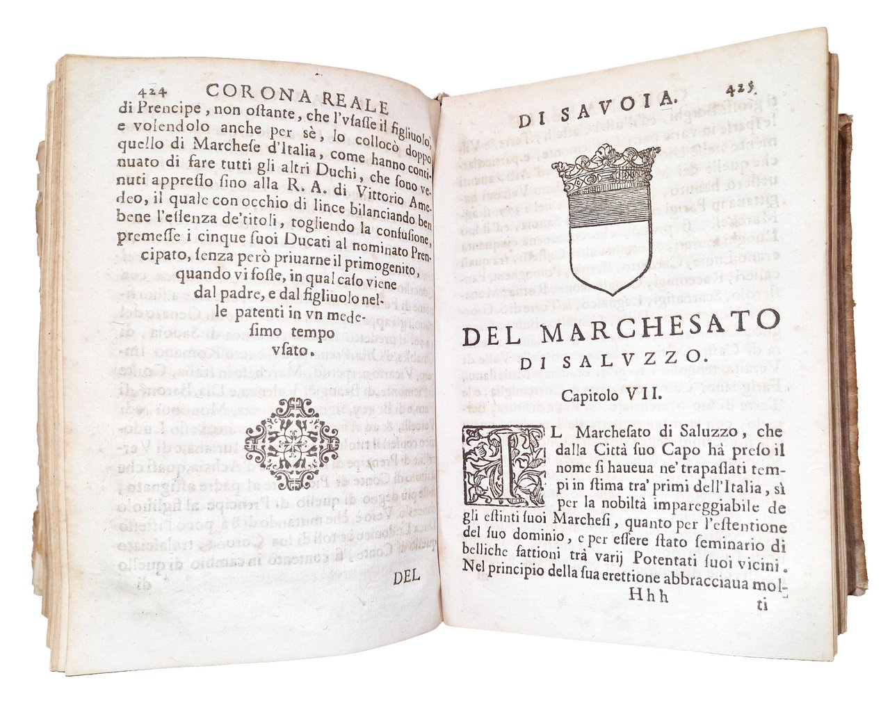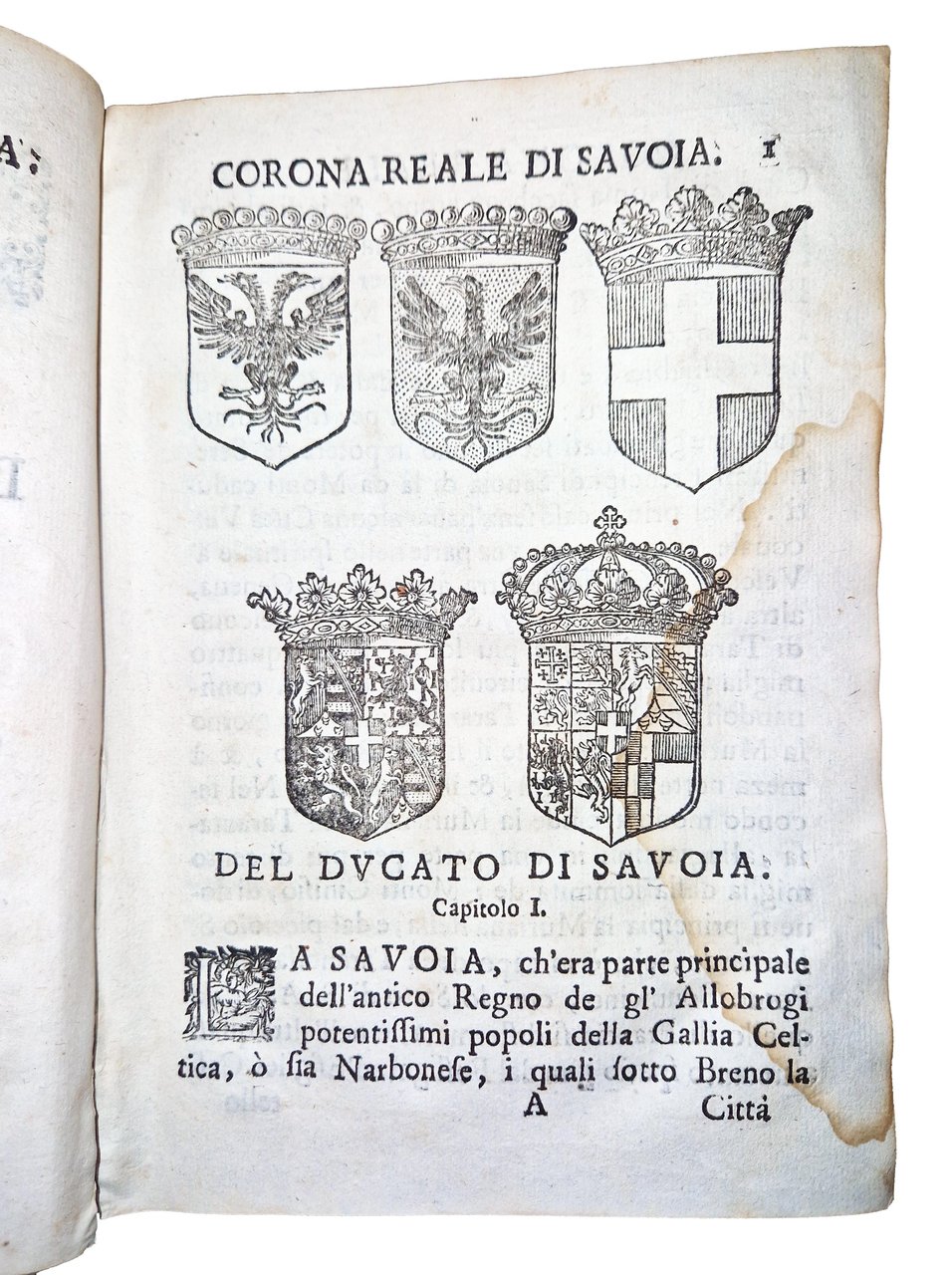 in-4°, 192x132 mm, leg. coeva in piena pergamena, con titolo calligrafato al dorso; due parti legate in un volume; pp. [46], 531, [37]; [16], 589, [47]. Fregio xilografico con corona su entrambi gli occhietti; stemma dei Savoia, coronato, sorretto da due leoni rampanti, xilografato sui frontespizi. Testatine, fregi e iniziali xilografiche. Un ritratto xilografico a mezza pagina dell'Autore al recto della quarta c. nn. Della seconda parte. Numerosi stemmi delle provincie sabaude in xilografia a m. pag. (35 stemmi di città e domini sabaudi e 2 stemmi vescovili). Titolo a entrambi gli occhietti: "Corona reale di Savoia". Alle carte [a]2r-[a]3r della prima parte lettera dedicatoria dell'Autore a Carlo Emanuele II, duca di Savoia. La seconda parte fu pubblicata nel 1657. Prima edizione di questa corposa e importante opera sulla storia piemontese dell'epoca; in essa l'autore riporta con grande dettaglio tutte le possibili informazioni sugli Stati governati dal principe Carlo Emanuele II (1634-1675), con l'intento di formare una "corona reale" da porre sul capo del sovrano. Il volume fu anche ripubblicato in una successiva edizione nel 1777. Francesco Agostino Della Chiesa (1593-1662) fu Vescovo di Saluzzo, storiografo, cosmografo e consigliere di Vittorio Amedeo I. Rif.: IT\ICCU\TO0E\001871. OCLC, 1360395235 e 1360405398. Vinciana, 979: "Opera importante per l'araldica sia per le notizie sia per le incisioni delle principali famiglie piemontesi". Cond.: Tracce d'uso alla legatura (macchia al dorso, in corrispondenza del titolo calligrafato). Lentezza della legatura di alcune carte. Carte in generale abbastanza pulite, occasionali bruniture, presenza di gore d'umido al margine esterno di alcune delle prime 30 carte della prima parte. Esemplare in buone condizioni generali.