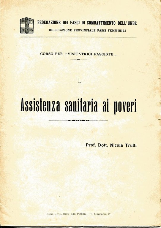 Cartellina con laccio in tela contente XXXIV fascicoli di circa 10 pp ciascuno del Corso per "visitatrici fasciste" a cura della Federazione dei fasci di combattimento dell'Urbe e 4 fascicoli (36, 38, 39 e 40) a cura della Federazione provinciale dei fasci femminili dell'Urbe. Conferenze di argomento vario dalla "Assisstenza sanitaria ai poveri" alle "Cause e profilassi del traviamento femminile" a cura di svariati relatori. Lievi abrasioni alla cop. di qualche fascicolo e strappetto con restauro alla cartellina Buono (Good) .
