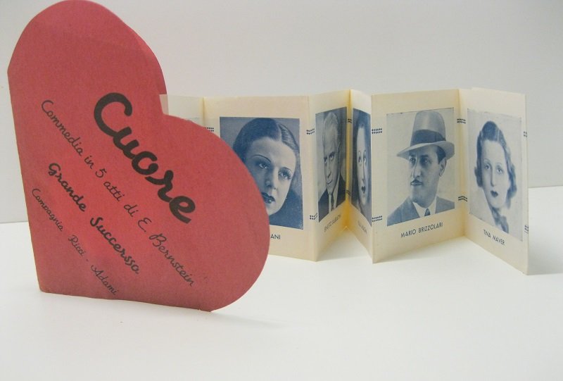 Bel pieghevole che pubblicizza la commedia Cuore portata in scena dalla compagnia Ricci-Adani. Un cuore rosso (cm 13 x 10 circa) in cartoncino con il titolo della commedia stampato in nero racchiude all'interno un piccolo pieghevole con apertura a fisarmonica di 18 facciate con i ritratti degli attori della compagnia al recto e al verso fotografie di scene tratte dallo spettacolo.