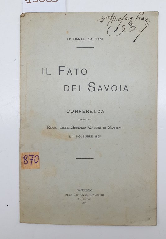 Dante Cattani Il fato dei Savoia conferenza tenuta nel Regio liceo ginnasio Cassini di Sanremo 11 novembre 1897 tipografia Biancheri 1897