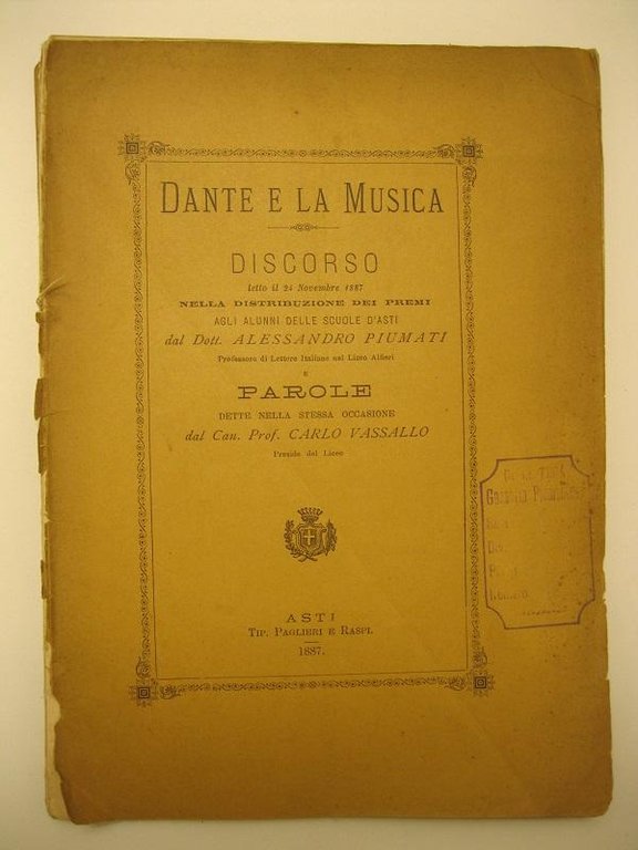 Dante e la Musica. Discorso letto il 24 Novembre 1887, nella distribuzione dei premi agli alunni delle scuole d'Asti dal dott. Alessandro Piumati, professore di Lettere Italiane nel Liceo Alfieri e Parole dette nella stessa occasione dal Can. Prof. Carlo Vassallo, Preside del Liceo