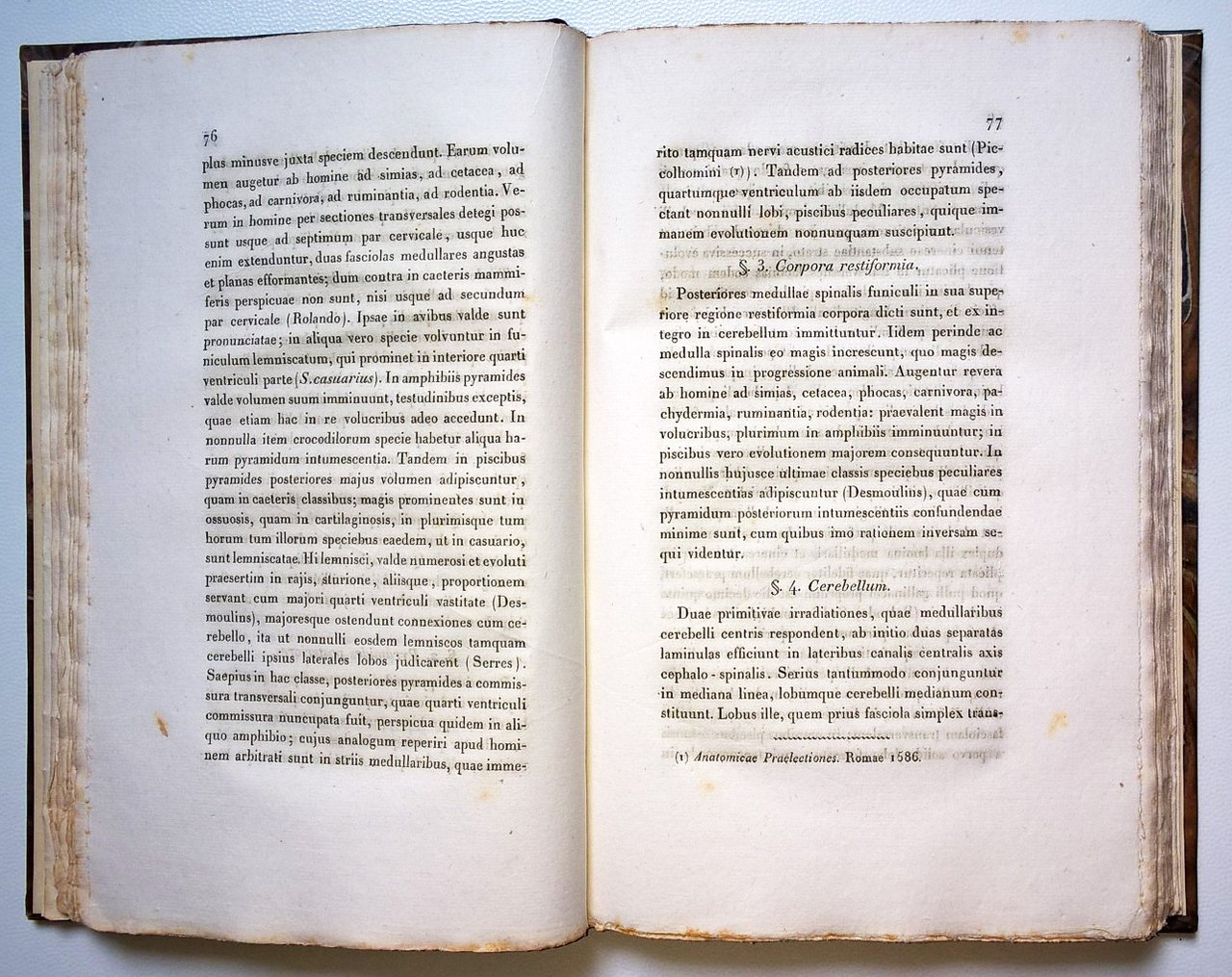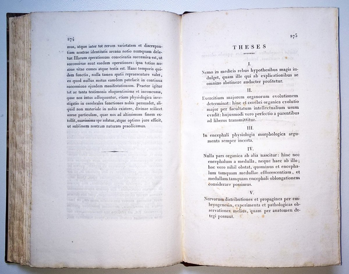 in-8°, 230x150 mm, leg. moderna in mezza pelle e carta marmorizzata ai piatti, titolo a caratteri dorati al dorso; pp. 276. Testo in latino. Opera medica a cura di Giuseppe Meneghini (1811-1889), geologo, paleontologo, primo presidente della Società Geologica Italiana, medico, professore di chimica e botanica, senatore e patriota. "Compilazione che mostra molta diligenza, studio e discernimento … a chiarire le funzioni delle singole parti del cervello, del midollo allungato, del midollo spinale …" (estratto dal "Giornale di letteratura, scienze ed arti compilato da vari letterati" Milano, 1835). Prov.: Sigillo in cera-lacca al frontespizio ed etichetta incollata al verso dellla prima guardia libera ant. (Ex libris Loris Premuda). Rif.: IT\ICCU\RAV\0329106. OCLC, 876424128. Cond.: Legatura moderna. Lievi fioriture, in particolare al frontespizio. Carte in barbe. Opera nel complesso in condizioni molto buone.