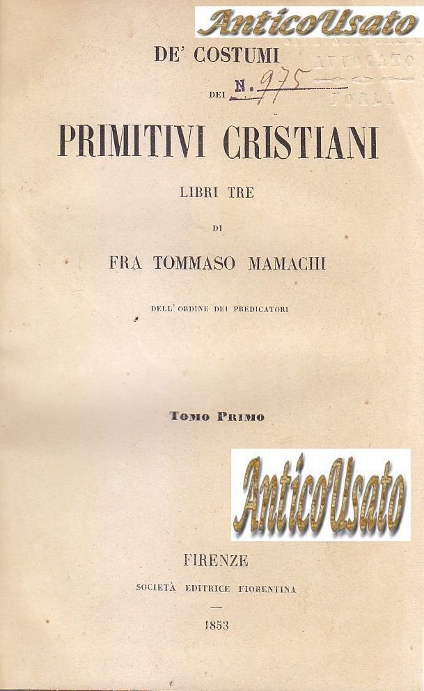 DE’ COSTUMI DEI PRIMITIVI CRISTIANI di Fra Tommaso Mamachi 1853 libro antico