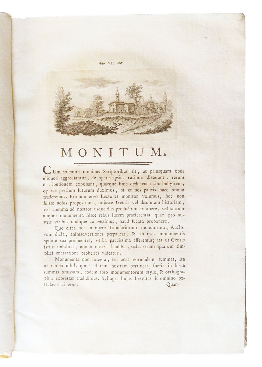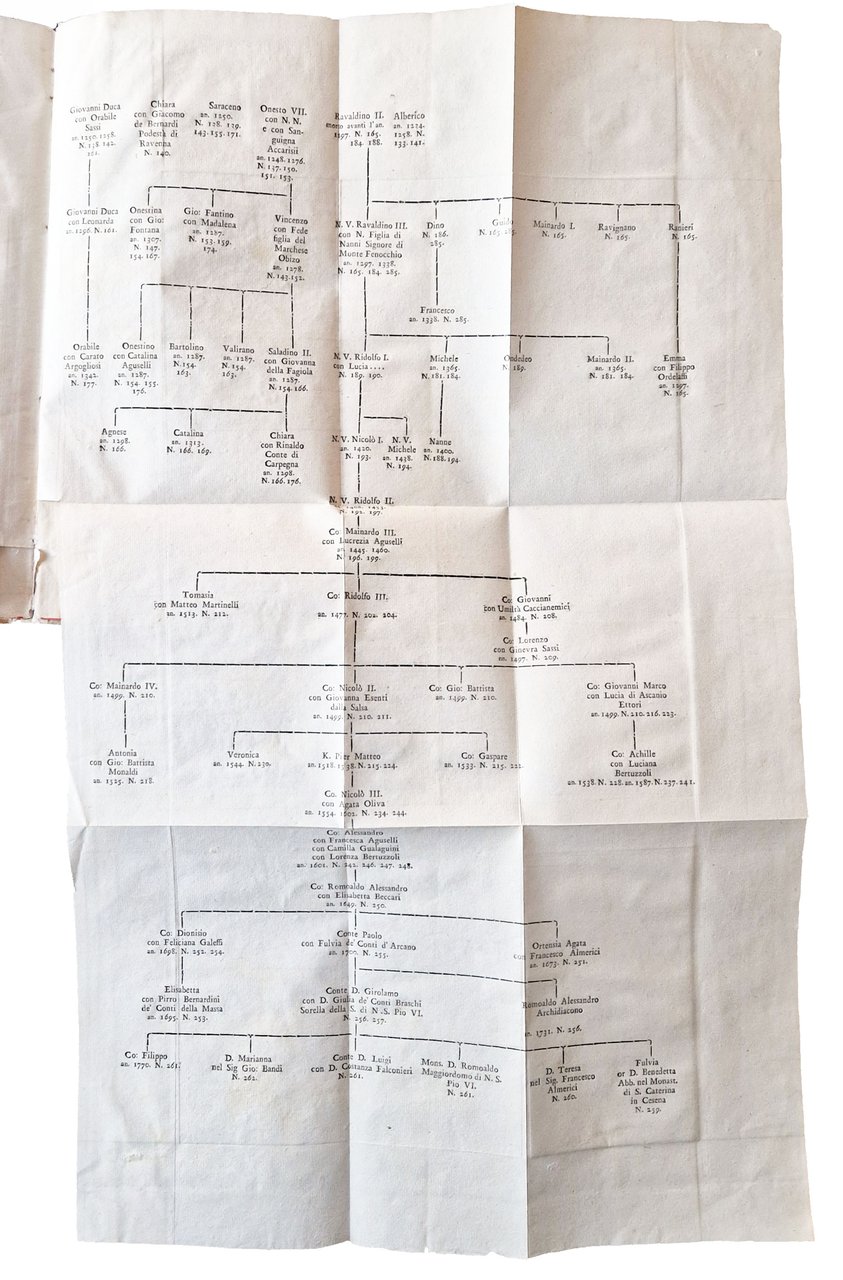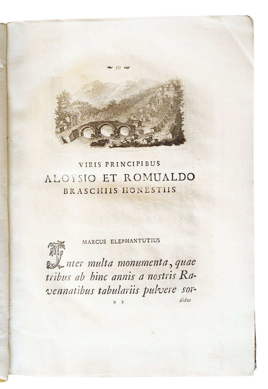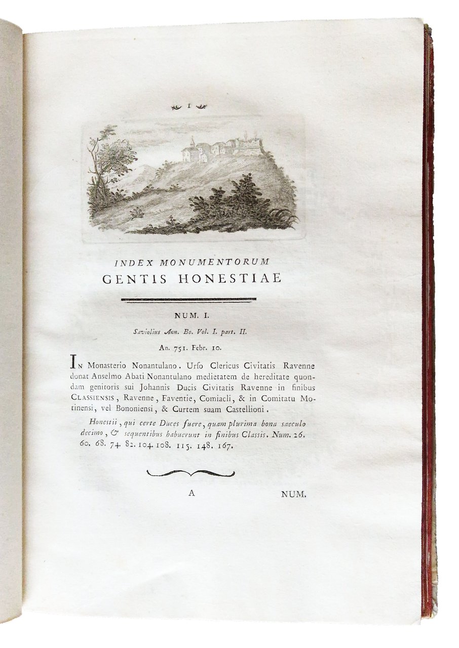 in-4°, 310x220 mm, leg. coeva rigida in pergamena, dorso a cinque nervi, titolo manoscritto al dorso, tagli colorati di rosso; pp. XXXII, 181, [1], [2] c. di tav., [2] c. di tav. genealogiche, numerose ill. calcografiche. Opera illustrata al frontespizio con vignetta calcografica alle armi della famiglia Onesti; 7 belle vedutine incise in rame poste a mo' di testatine e finalini; 2 tavole di alberi genealogici più volte ripiegate in fine. Delle due calcografie a piena pagina, la prima è sottoscritta: Ercole da Ferrara pin., Monghini del., Eredi sc.; la seconda: Monghini del., Eredi sc. Il nome dell'A., Marco Fantuzzi [Marcus Elephantutius], nella dedica fatta ai signori principi Luigi e Romualdo Braschi Onesti dall'A. stesso a Gualdo nel dicembre 1785. Gli Onesti furono una nobile famiglia di Ravenna nota dal IX al XVIII secolo; i Braschi furono una famiglia nobile dimorante anticamente a Cesena. Romoaldo (o Romualdo) Braschi Onesti (1753-1817) è stato un cardinale italiano, nipote di Papa Pio VI; suo fratello fu Luigi Braschi Onesti (1745-1816), comandante della guardia pontificia e primo sindaco di Roma in età napoleonica. Prima edizione di quest'opera sulla famiglia degli Onesti di Cesena e Ravenna, stampata in tiratura limitata, a cura di Marco Fantuzzi (1740-1806), conte, magistrato, mecenate, agronomo; nominato procuratore dell'Emilia dal pontefice Pio VI. De Tipaldo II, 54: «Bella edizione e rara, avendone l'autore fatto stampare solamente dugento esemplari»; Spreti 1446. Prov.: Etichetta ex-libris incollata al contropiatto anteriore (Libreria antiquaria ditta E. Martelli Bologna). Rif.: IT\ICCU\RAVE\014816. OCLC, 878000262. Cond.: Tracce d'uso alla legatura (la pergamena di rivestimento dei piatti risulta molto tesa, facendo rimanere il libro leggermente aperto. Testo molto marginoso, su carte spesse e croccanti, prevalentemente pulite, con alcune bruniture. Esemplare decisamente molto buono.