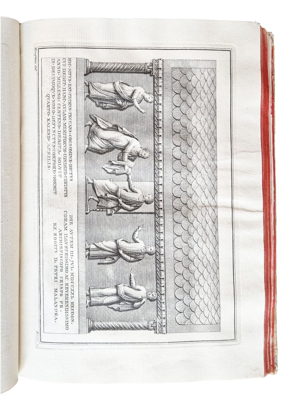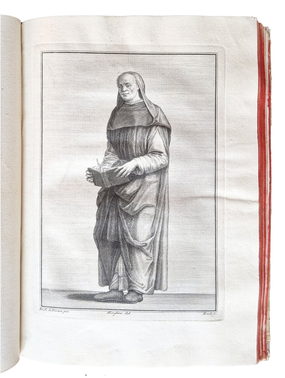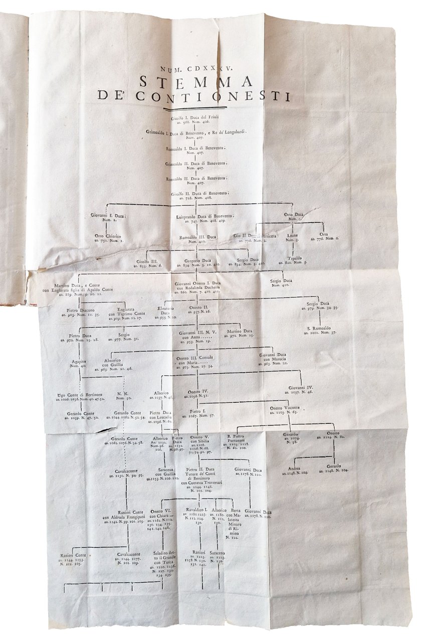 in-4°, 310x220 mm, leg. coeva rigida in pergamena, dorso a cinque nervi, titolo manoscritto al dorso, tagli colorati di rosso; pp. XXXII, 181, [1], [2] c. di tav., [2] c. di tav. genealogiche, numerose ill. calcografiche. Opera illustrata al frontespizio con vignetta calcografica alle armi della famiglia Onesti; 7 belle vedutine incise in rame poste a mo' di testatine e finalini; 2 tavole di alberi genealogici più volte ripiegate in fine. Delle due calcografie a piena pagina, la prima è sottoscritta: Ercole da Ferrara pin., Monghini del., Eredi sc.; la seconda: Monghini del., Eredi sc. Il nome dell'A., Marco Fantuzzi [Marcus Elephantutius], nella dedica fatta ai signori principi Luigi e Romualdo Braschi Onesti dall'A. stesso a Gualdo nel dicembre 1785. Gli Onesti furono una nobile famiglia di Ravenna nota dal IX al XVIII secolo; i Braschi furono una famiglia nobile dimorante anticamente a Cesena. Romoaldo (o Romualdo) Braschi Onesti (1753-1817) è stato un cardinale italiano, nipote di Papa Pio VI; suo fratello fu Luigi Braschi Onesti (1745-1816), comandante della guardia pontificia e primo sindaco di Roma in età napoleonica. Prima edizione di quest'opera sulla famiglia degli Onesti di Cesena e Ravenna, stampata in tiratura limitata, a cura di Marco Fantuzzi (1740-1806), conte, magistrato, mecenate, agronomo; nominato procuratore dell'Emilia dal pontefice Pio VI. De Tipaldo II, 54: «Bella edizione e rara, avendone l'autore fatto stampare solamente dugento esemplari»; Spreti 1446. Prov.: Etichetta ex-libris incollata al contropiatto anteriore (Libreria antiquaria ditta E. Martelli Bologna). Rif.: IT\ICCU\RAVE\014816. OCLC, 878000262. Cond.: Tracce d'uso alla legatura (la pergamena di rivestimento dei piatti risulta molto tesa, facendo rimanere il libro leggermente aperto. Testo molto marginoso, su carte spesse e croccanti, prevalentemente pulite, con alcune bruniture. Esemplare decisamente molto buono.