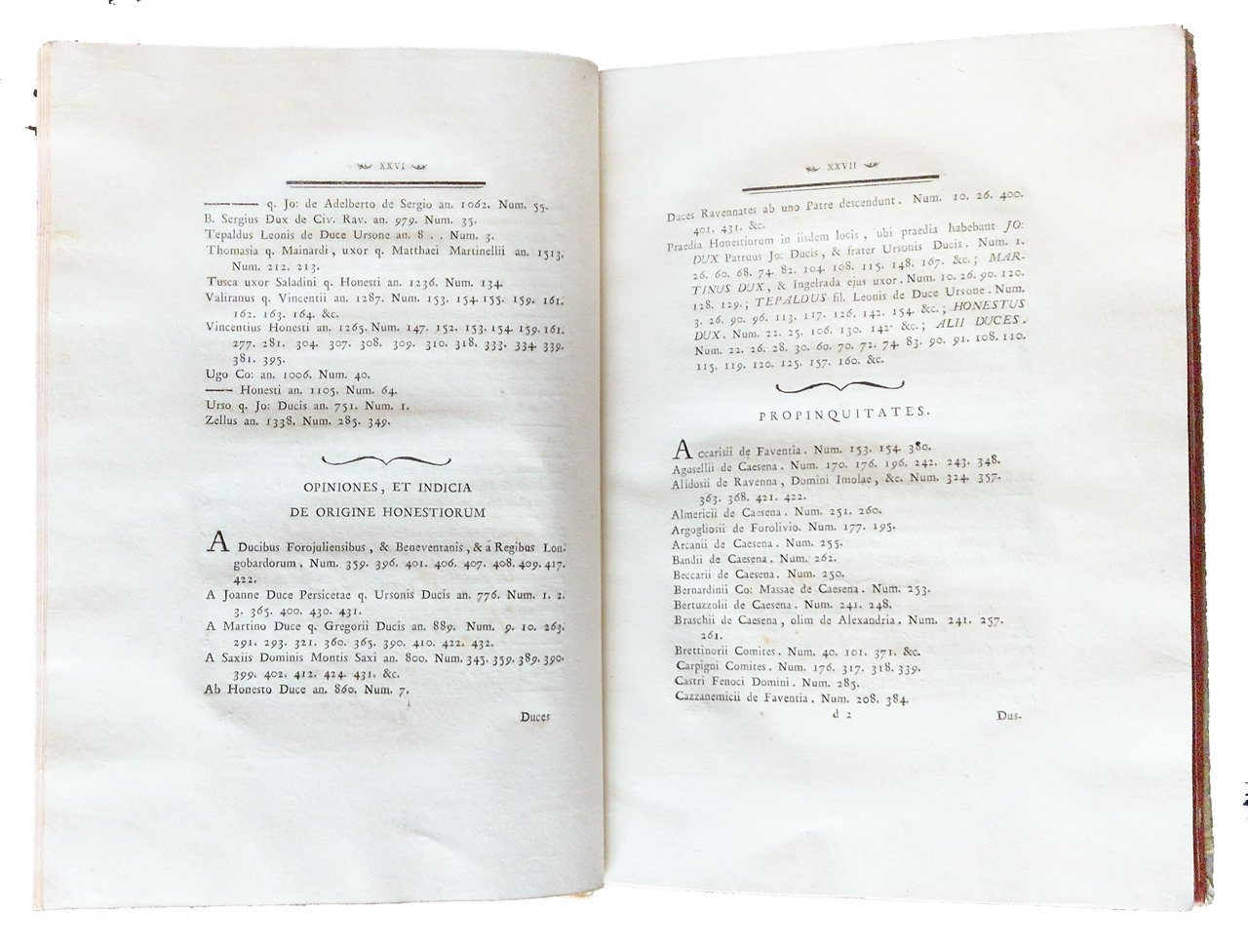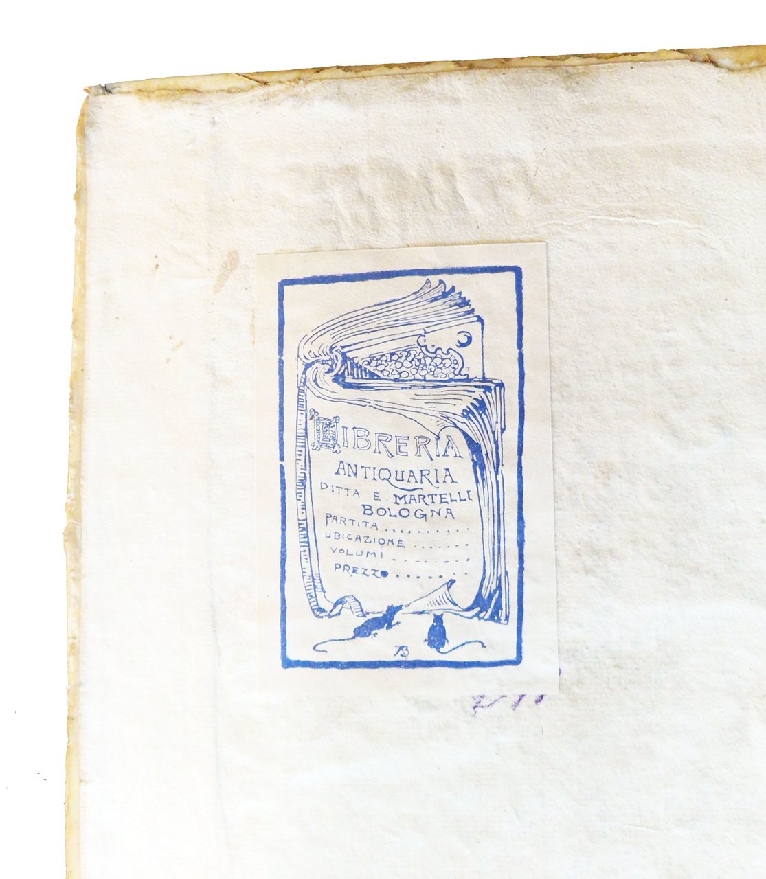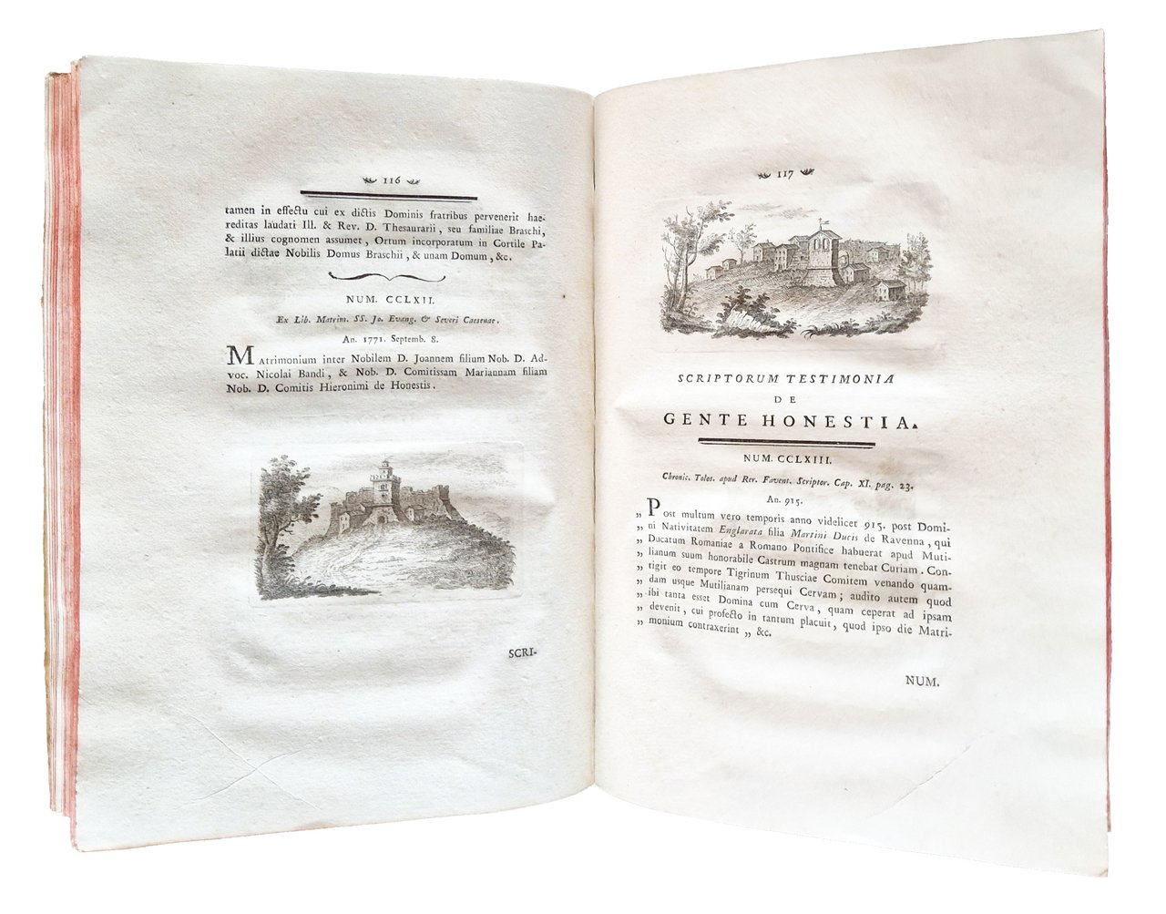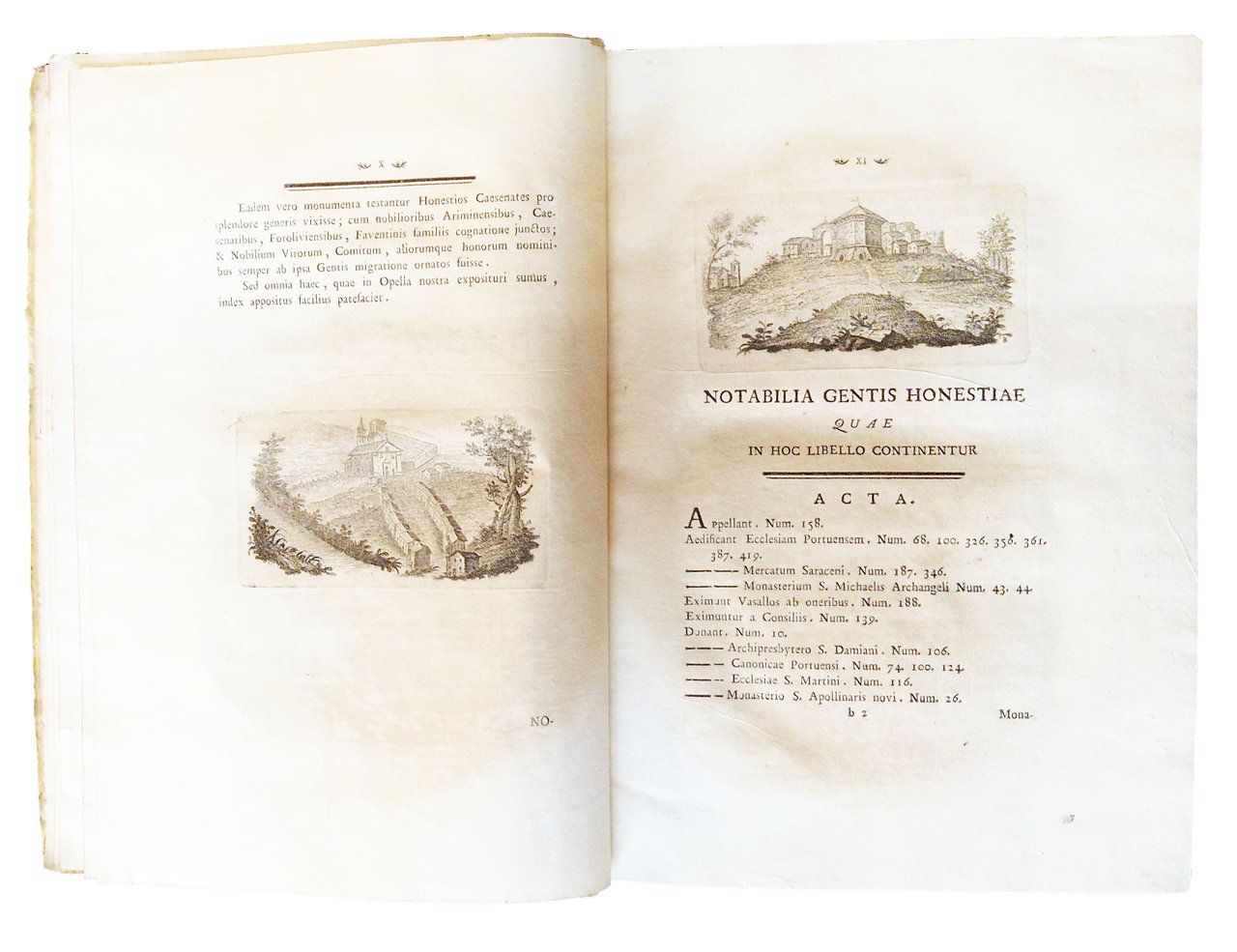 in-4°, 310x220 mm, leg. coeva rigida in pergamena, dorso a cinque nervi, titolo manoscritto al dorso, tagli colorati di rosso; pp. XXXII, 181, [1], [2] c. di tav., [2] c. di tav. genealogiche, numerose ill. calcografiche. Opera illustrata al frontespizio con vignetta calcografica alle armi della famiglia Onesti; 7 belle vedutine incise in rame poste a mo' di testatine e finalini; 2 tavole di alberi genealogici più volte ripiegate in fine. Delle due calcografie a piena pagina, la prima è sottoscritta: Ercole da Ferrara pin., Monghini del., Eredi sc.; la seconda: Monghini del., Eredi sc. Il nome dell'A., Marco Fantuzzi [Marcus Elephantutius], nella dedica fatta ai signori principi Luigi e Romualdo Braschi Onesti dall'A. stesso a Gualdo nel dicembre 1785. Gli Onesti furono una nobile famiglia di Ravenna nota dal IX al XVIII secolo; i Braschi furono una famiglia nobile dimorante anticamente a Cesena. Romoaldo (o Romualdo) Braschi Onesti (1753-1817) è stato un cardinale italiano, nipote di Papa Pio VI; suo fratello fu Luigi Braschi Onesti (1745-1816), comandante della guardia pontificia e primo sindaco di Roma in età napoleonica. Prima edizione di quest'opera sulla famiglia degli Onesti di Cesena e Ravenna, stampata in tiratura limitata, a cura di Marco Fantuzzi (1740-1806), conte, magistrato, mecenate, agronomo; nominato procuratore dell'Emilia dal pontefice Pio VI. De Tipaldo II, 54: «Bella edizione e rara, avendone l'autore fatto stampare solamente dugento esemplari»; Spreti 1446. Prov.: Etichetta ex-libris incollata al contropiatto anteriore (Libreria antiquaria ditta E. Martelli Bologna). Rif.: IT\ICCU\RAVE\014816. OCLC, 878000262. Cond.: Tracce d'uso alla legatura (la pergamena di rivestimento dei piatti risulta molto tesa, facendo rimanere il libro leggermente aperto. Testo molto marginoso, su carte spesse e croccanti, prevalentemente pulite, con alcune bruniture. Esemplare decisamente molto buono.