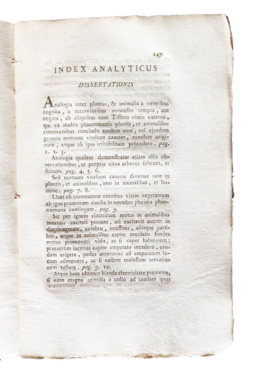 in-8°, 214x140 mm, leg. coeva in brossura, con carta marmorizzata ai piatti; pp. XVIII, [2], 157, [3]. Stemma calcogr. del Regno di Sardegna sul front. Prima edizione di questa celebre tesi sull'influenza dell'elettricità atmosferica sulla vegetazione, redatta a cura del Gardini e premiata dall'Accademia di Lione nel 1782. Francesco G. Gardini di S. Damiano d'Asti (1740-1816), medico e fisico astigiano, coltivò una grande passione per le ricerche di chimica e di fisica, in particolare creandosi un personale gabinetto di fisica dove ripeteva gli esperimenti di B. Franklin e del suo maestro Beccaria. Gardini scrisse opere di pregio e parecchie dissertazioni scientifiche che furono premiate dalle Accademie d’Italia, Francia, Belgio, Germania. Rif.: IT\ICCU\SBLE\000629. OCLC, 1417500076. Cond.: Segni d'uso alla legatura (macchie, abrasioni, mancanze soprattutto sui bordi e al dorso). Carte in barbe, abbastanza pulite. Buon esemplare.