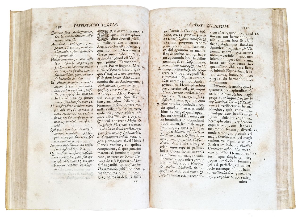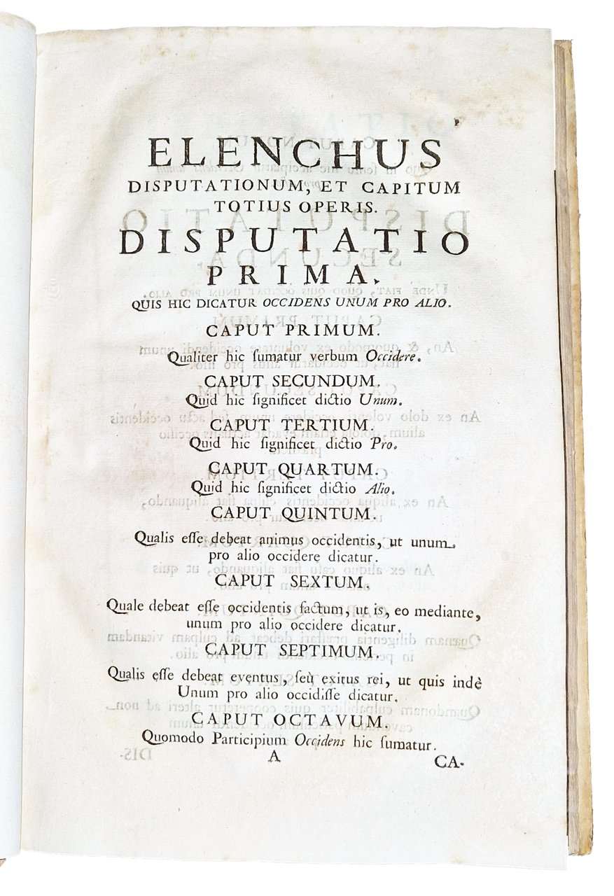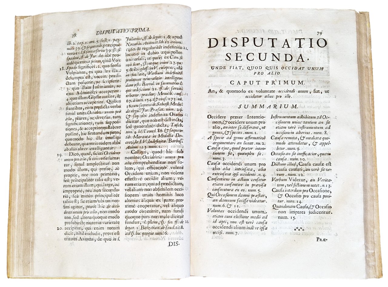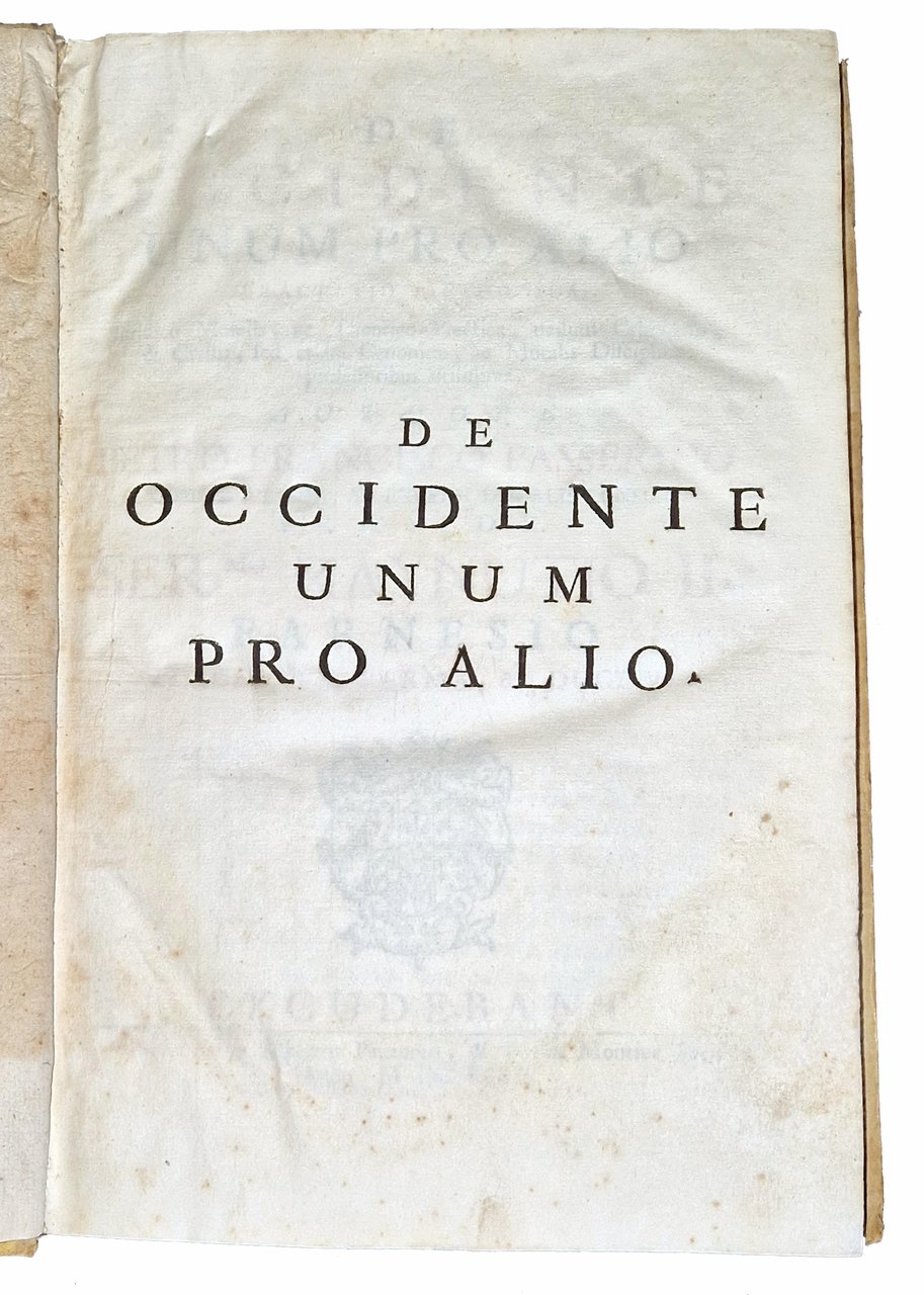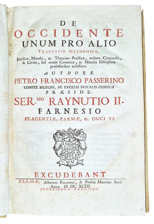 in-2°, 304x198 mm, leg. coeva in piena pergamena rigida, con dorso a cinque nervi, titolo calligrafato e fregi al dorso; pp. [16], xxvii, [1], 425, [3]. Titolo dell'occhietto: "De occidente unum pro alio". Stemma xilografico del dedicatario, Ranuccio Farnese, sul frontespizio; testo disposto su due colonne. Frontespizio stampato in rosso e nero; marca xilografica dello stampatore al colophon [Due putti che tengono un cartiglio bianco con le iniziali AP in alto e PM in basso in cornice figurata e un nastro con il motto: Ad omnia paratus]. Edizione originale di questa trattazione metodica, giuridico-morale e teorico-pratica, non solo della disciplina penale e civile, ma anche canonica e morale, redatta a cura di Pietro Francesco Passerini (ca. 1612-1695), Conte di Bilegno in Val Tidone, teologo, giurista e letterato; fu Protonotario apostolico, lettore di teologia morale a Piacenza tra il 1652 al 1663 e funzionario dello Stato Farnesiano. Rif.: IT\ICCU\MILE\005344. OCLC, 955359462. Cond.: Lievi tracce d'uso alla legatura. Carte pulite e croccanti, con presenza occasionale di alcune macchie e fioriture. Esemplare decisamente molto buono.