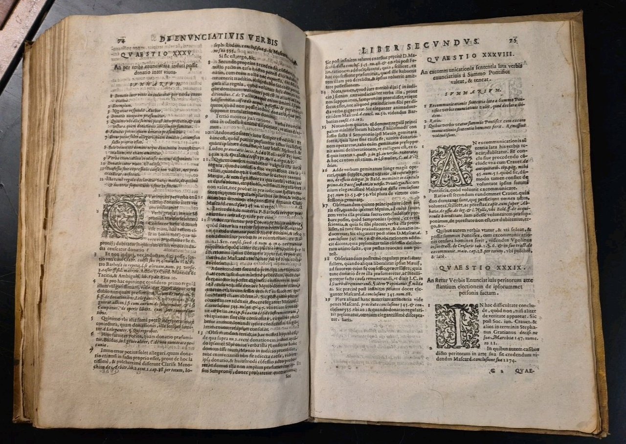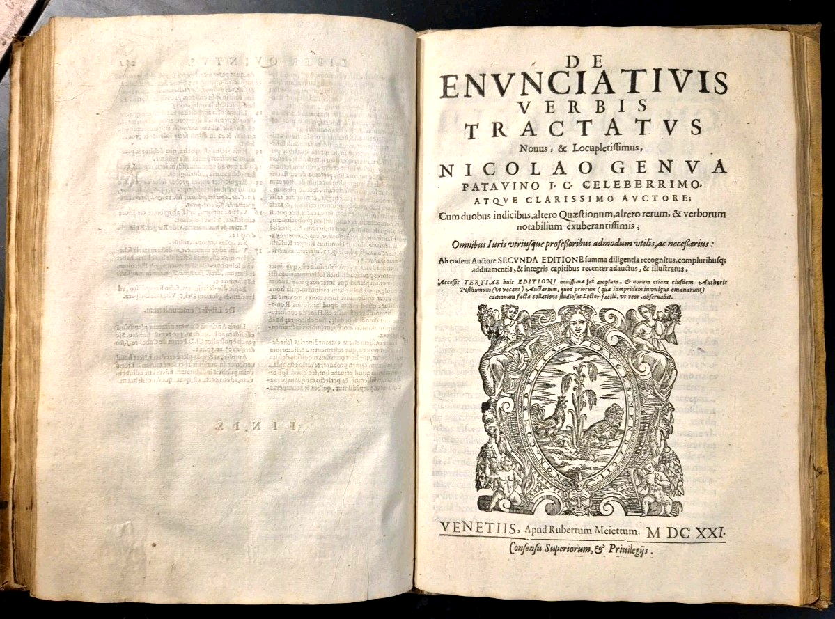 VENETIIS Apud Rabertum Meiettum. 1621. . (XLVIII), 289 pagine (ma per errore di numerazione l’ultima è segnata 281). Insieme è rilegato DE ENUNCIATIVIS VERBIS TRACTATUS novus e locuplentissimus Nicolau Genua, (XVIII), 104 pagine (ma per errore di numerazione l’ultima è segnata 74) Capilettera istoriati e finalini, bella marca tipografica al frontespizio con titoli rosso e nero. Copertina postuma in tutta pergamena con titolo manoscritto al dorso. Dimensioni: 34 x 23 cm. Stato di conservazione: buono (pagine ingiallite, fioriture, antica firma di appartenenza, piccoli danni alla rilegatura, numerosi errori di numerazione ma esemplare COMPLETO) CONTROLLATO PAGINA PER PAGINA Libro usato saggistica