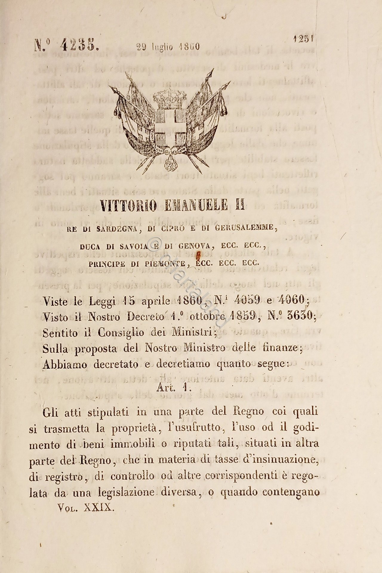 Decreto Regno Sardegna - Normativa atti e tasse sugli immobili del Regno - 1860