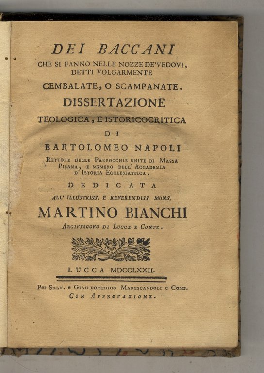 Dei baccani che si fanno nelle nozze de' vedovi, detti volgarmente cembalate, o scampanate. Dissertazione teologica, e istoricocritica di Bartolomeo Napoli [.] dedicata all'illustriss. e reverendiss. mons. Martino Bianchi arcivescovo di Lucca e Conte.