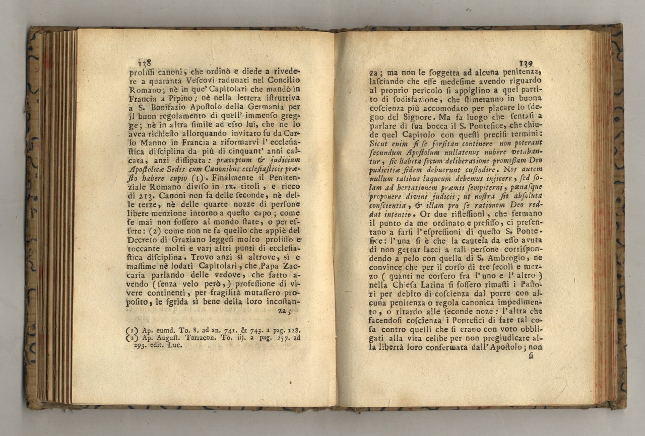 Lucca, per Salv. e Gian Domenico Marescandoli e Comp., 1772, in-8, cartonatura decorata di poco successiva, tagli spruzzati, pp. [16], 276. Prima edizione. L'autore era rettore nella parrocchia di Massa Pisana e nel testo stigmatizza le allegre consuetudini in uso in Toscana nelle nozze dei vedovi. Piccola traccia di tarlo al margine bianco interno alto delle prime 60 carte (in 53 carte solo puntiforme in 7 a breve camminamento; il testo non è mai toccato).