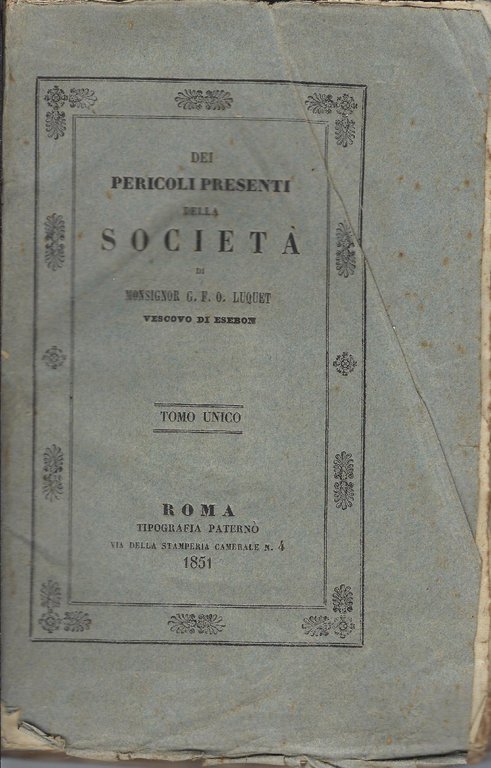 p. (6) + 403 la copertina riporta anno 1851 ( ma Stampato nel 1850) Mediocre (Poor) copertina con segni del tempo e piccole mancanze, lievi fioriture su frontespizio e pagine , piccola mancanza su frontespizio, tagli fioriti e irregolari. Ottima leggibilità.