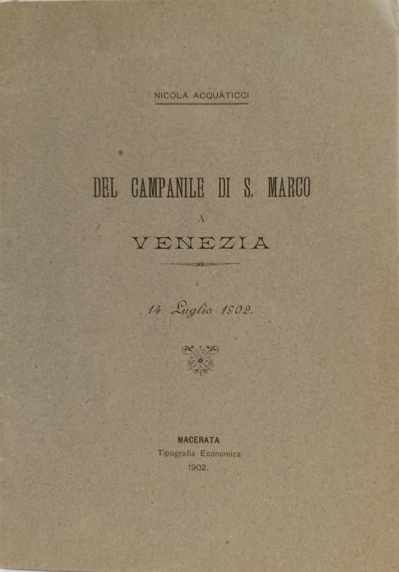 in-8, pp. 16, bross. edit. Ricordi del triste evento che nel 1902 provocò il crollo del campanile a Venezia, pubblicato solo pochi giorni dopo. [333]