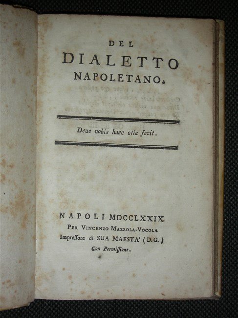 in-8, pp. 184, leg. p. perg. coeva con tit. oro al d. Tagli spruzzati. Rara ediz. orig. di questa rara opera sul dialetto napoletano composta dal Galiani (1728-1787) autore del celebre trattato Della Moneta, in cui "difende" il vernacolo della sua città natale dalle influenze della lingua toscana. Legg. fioriture. [065]