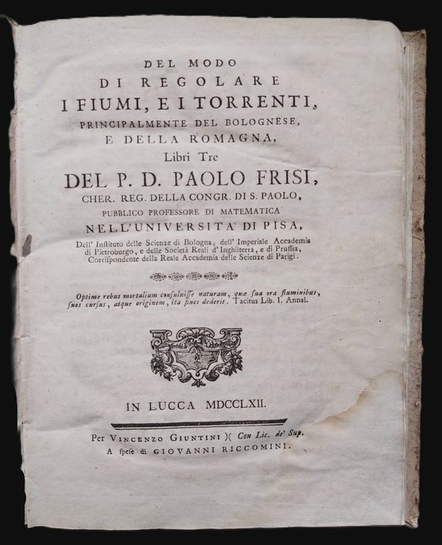 DEL MODO DI REGOLARE i fiumi, e i torrenti principalmente del Bolognese e della Romagna Libri tre del P. D. Chier. Reg. della Congr. di San Paolo pubblico professore di Matematica nell’Università di Pisa.