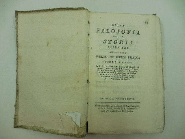 In 8, pp. (8) + 412 + (4). Cart. coeva con rinforzo al d. Bordi intonsi. Edizione originale non comune di uno dei saggi piu' importante di questo scrittore riminese, attento viaggiatore, e studioso di estetica. Questo del Bertola fu il primo libro che in Italia porto' titolo di filosofia della storia; libro e titolo poco esplorati dalla tradizionale letteratura, eppure rappresentativi di un pensiero che merita di essere compreso in se' e per se', considerato l'ancoraggio ad alcune delle fondamentali esperienze culturali del tempo: il confronto critico con la storiografia illuministica e i modelli di 'storia filosofica' di Montesquieu e Voltaire, di Condillac e Gibbon; l'adesione al concetto di 'civilta' nell'indagine sulle 'cagioni', i 'mezzi' e gli 'effetti' del corso storico; il ritorno all'antico e l'analisi delle cause fisiche e morali della 'floridezza' e della 'decadenza' delle nazioni; la fortuna dell'esperienza massonica e la problematica conciliazione del principio 'ermetico' della ciclicita' della storia con la teoria illuministica del progresso. In sostanza l'autore riminese credeva, sbagliandosi, essere ormai finite le grandi rivoluzioni, e che i cambiamenti sarebbero avvenuti attraverso graduali trasformazioni.