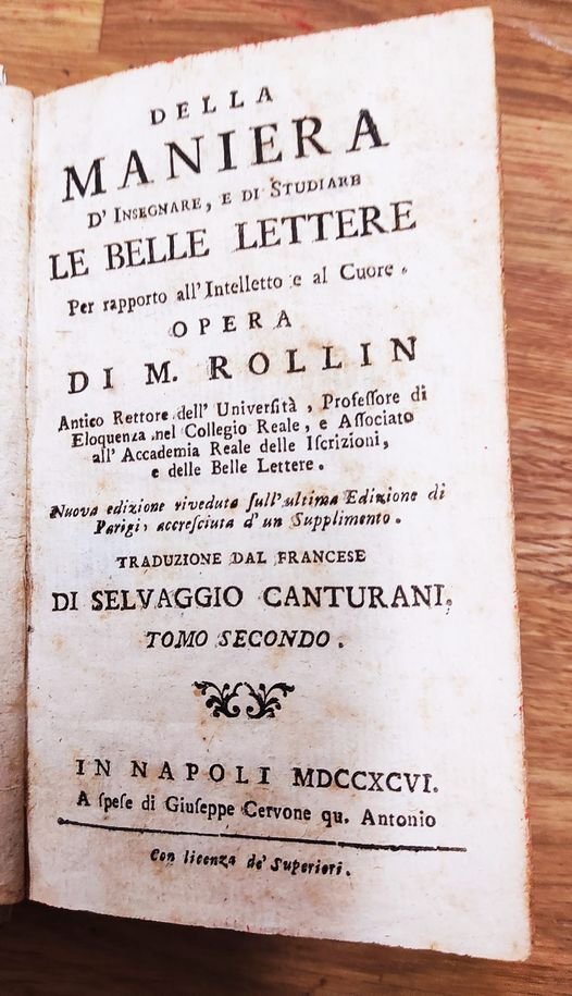 Della maniera d'insegnare, e di studiare le belle lettere per rapporto all'Intelletto e al Cuore. Opera di m. Rollin...traduzione dal francese di Selvaggio Canturani. Nuova edizione riveduta sull'ultima edizione di Parigi, accresciuta d'un supplimento. Tomo Primo - Quarto