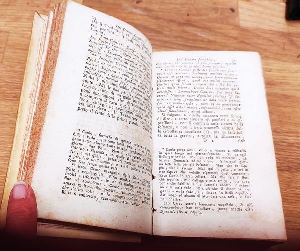 In 16, pp. 562 (14), 496, 424 (8), 517 (9). Rilegatura coeva tutta pergamena con fregi e titoli impressi in oro sul dorso. Capilettera e frontalini xilog. Rare e lievi fioriture e qualche rara brunitura da inchiostro in alcune pagine. Un alone all'angolo inferiore di pag. 9 del Tomo II, una macchiolina di inchiostro a pag 69, righe 22 e 23, che lede alcune lettere Buono (Good) .