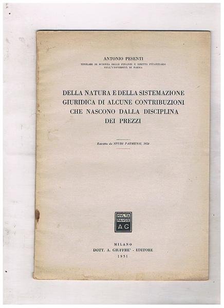 Della natura e della sistemazione giuridica di alcune contribuzioni che nascono dalla disciplina dei prezzi. Estratto da Studi Parmensi, 1950.
