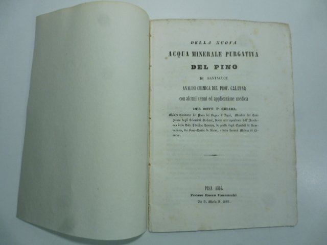 In 8 (cm 15 x 21,5), pp. 32. Brossura rifatta con carta d'epoca. Descrizione chimico-fisica delle acque minerali salino-purgative scoperte presso il Villaggio di Santaluce (Rosignano-Pisa), nel podere denominato del Pino di Domenico Benci.