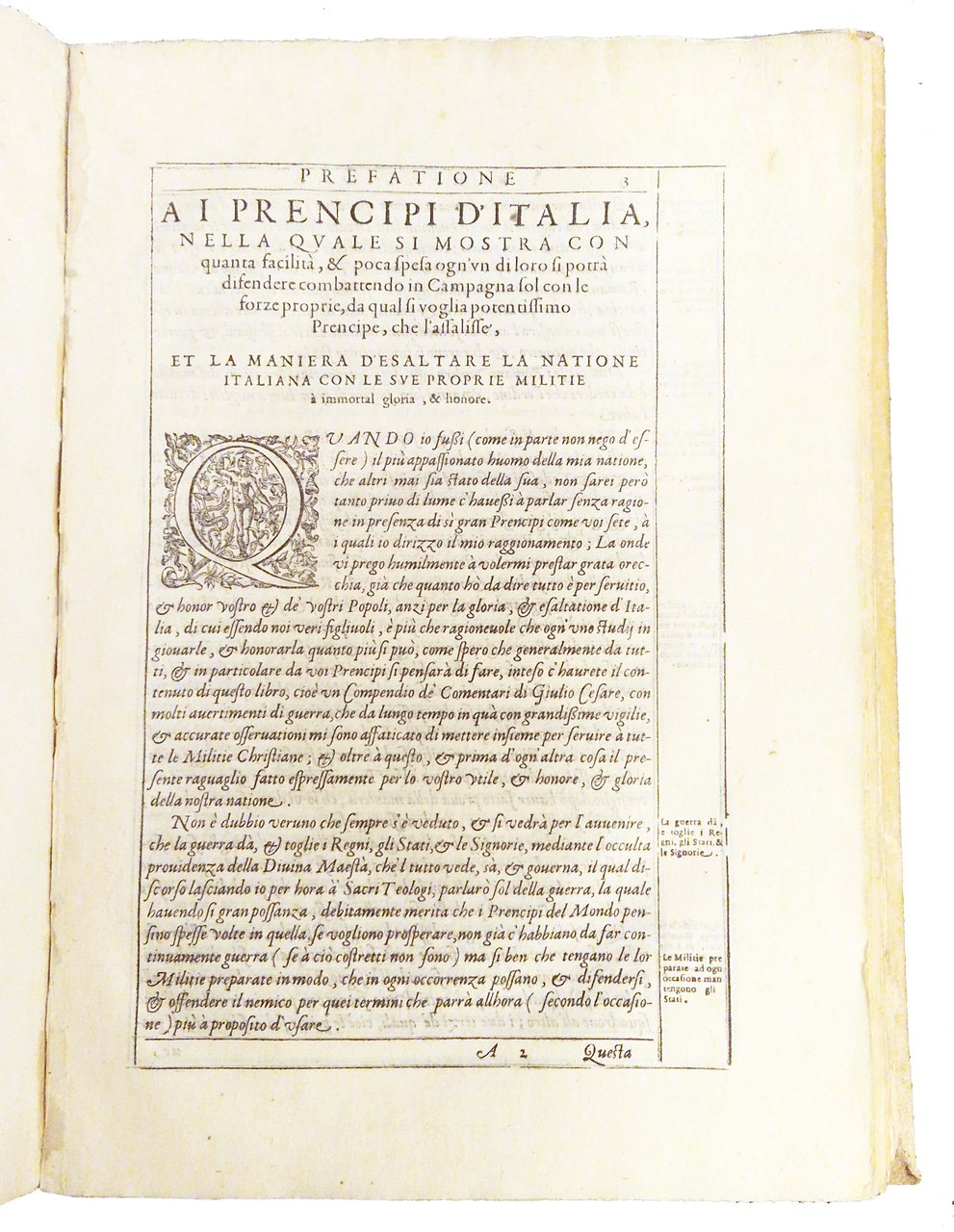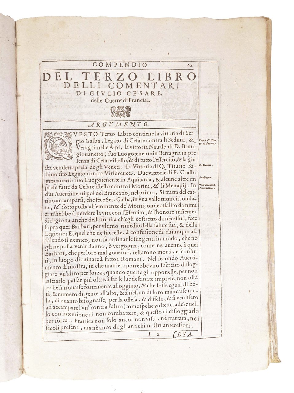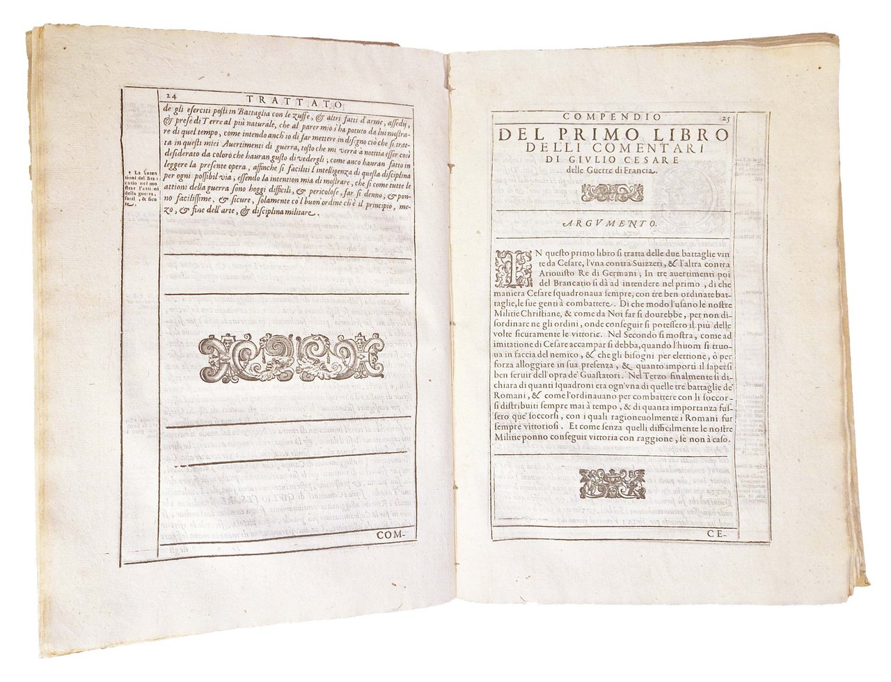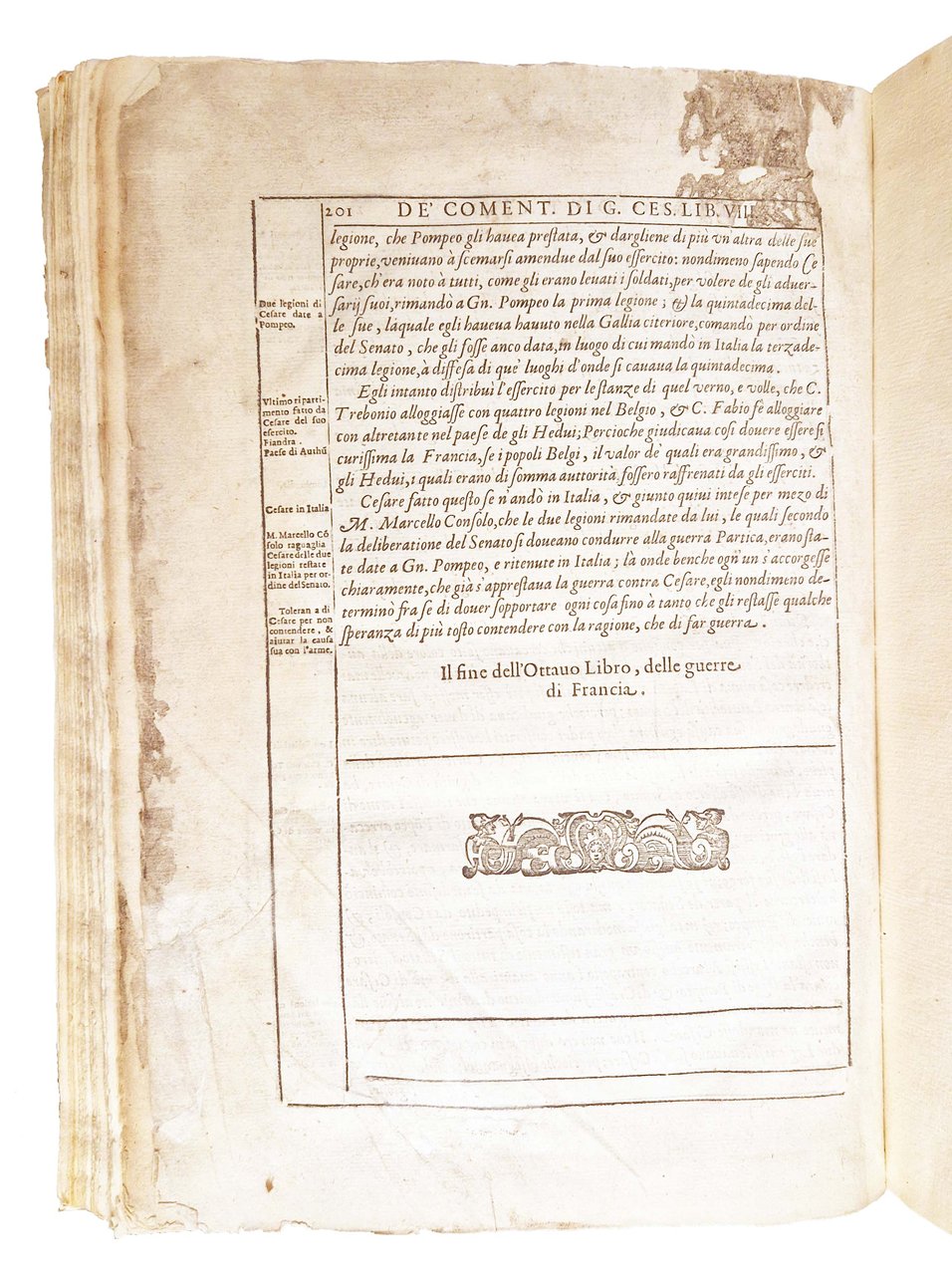 in-2°, 314x216 mm, leg. originale in pergamena successivamente restaurata; pp. 201 [i.e. 202], [2]. La c. I1r numerata 61, il v. è fuori numerazione e bianco, la c. I2r numerata 62. Ripetute nelle numerazione la p. 64. Marca xilografica sul front. (Aquila su corona come cimiero di uno scudo. Nello scudo ancora Aldina accollata da delfino e cimata da altra aquila). Iniziali e fregi xilografici. Tutte le pp. entro cornice xil. Per l'attribuzione a Giulio Cesare Brancaccio, cfr. DBI vol. 13 p. 780-784. Prima ed unica edizione Aldina di questo trattato di arte militare a cura del Brancaccio (1515?-1584?). L'opera è preceduta da una lunga prefazione, quindi dagli "Avertimenti di guerra del Brancatio … sopra i Comentari di Giulio Cesare" e infine da un "Brevissimo trattato delle Legioni & arme de' Romani al tempo di Giulio Cesare", cui seguono i commentari reinterpretati sulle tecniche di battaglia moderne. Rif.: IT\ICCU\TO0E\002137. CNCE 7431. OCLC, 909376625. Cond.: Tracce d'uso alla legatura (restauri al dorso, discreta tesatura della pergamena al piatto anteriore con leggero incurvamento al taglio laterale). Antico restauro al frontespizio, con ripristino di una porzione di carta mancante al margine superiore, senza perdite di testo. Testo marginoso su carte molto pulite. Tracce di antichi restauri ad alcune carte e occasionali piccoli lavori di tarlo al margine inferiore di alcune carte, non interessanti il testo. Piccola macchia al margine superiore interno dell'ultima pagina. Esemplare decisamente molto buono.