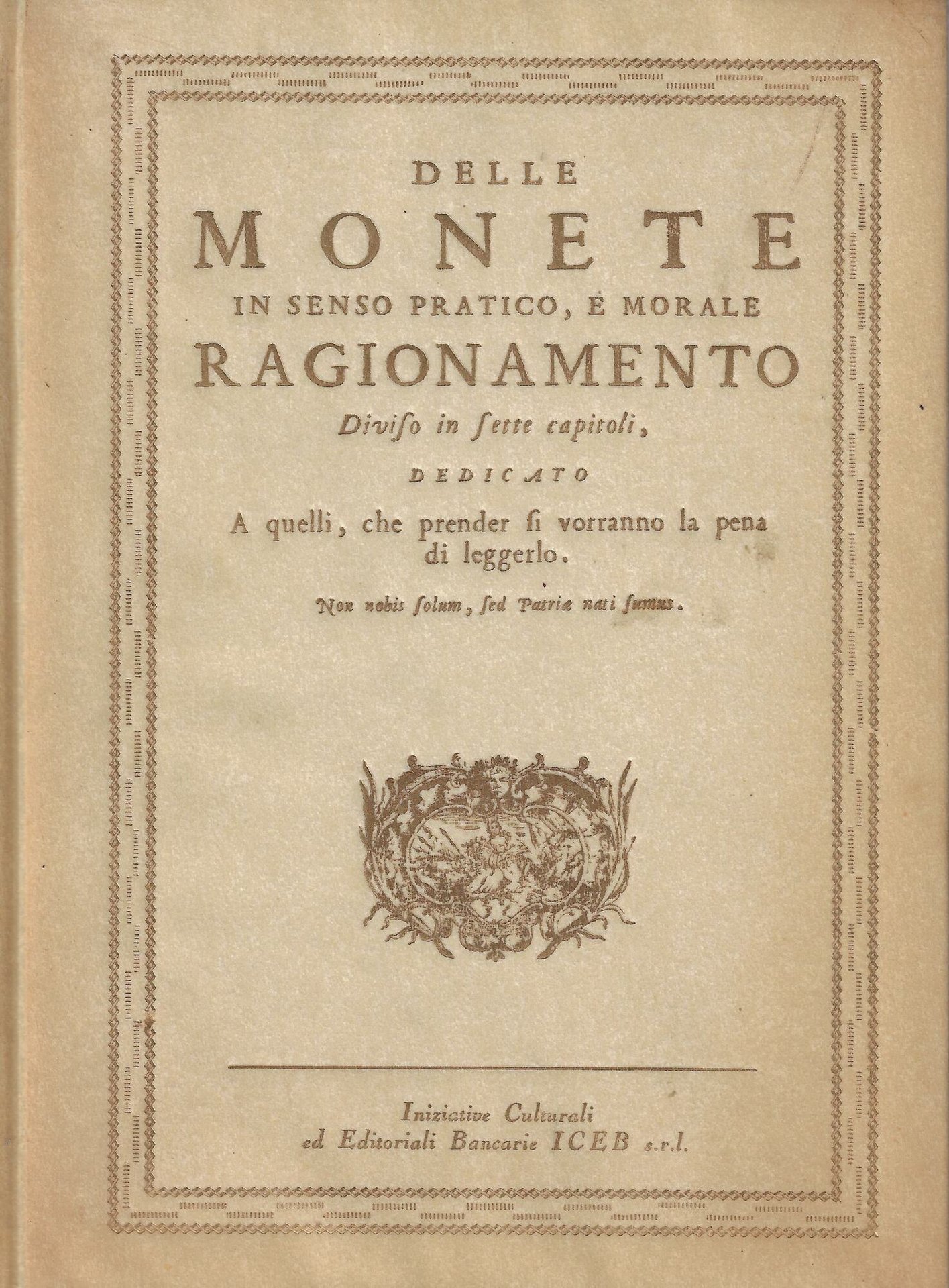 Delle monete in senso pratico, e morale : ragionamento diviso in sette capitoli, dedicato a quelli che prender si vorranno la pena di leggerlo (rist. anastatica)