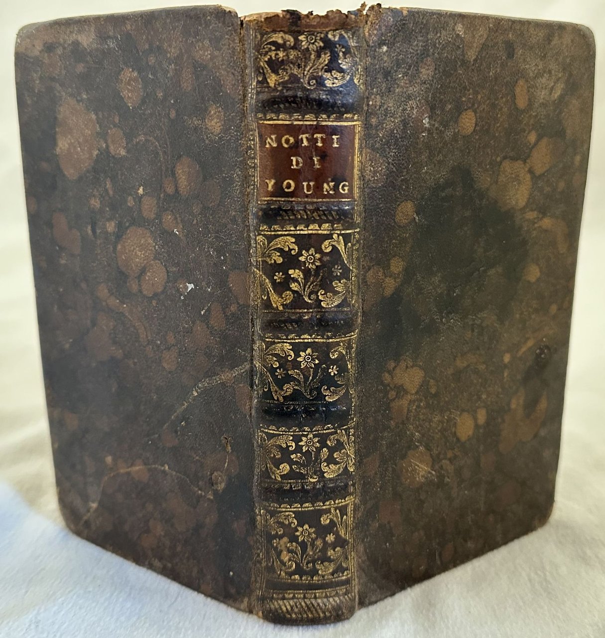 Edizione italiana del 1784 di questa celebre opera letteraria del poeta critico e filosofo inglese Edward Young (1683-1765). L'opera, pubblicata per la prima volta nel 1742 ebbe un notevole successo e venne tradotta in molte lingue. in Francia divenne un classico della scuola romantica. L'opera è in un volume ed è completa. Bella incisione calcografica in antiporta incisa da Giacomo Leonardis. Traduzione delle Notti a cura di Giuseppe Bottoni e del Giudizio Universale a cura di Clemente Filomarino (1775-1799). Ultima carta bianca. In buone condizioni e completo. Copertina in piena pelle coeva con titolo e decorazioni in oro al dorso in buone condizioni generali con lievi usure ai margini e dorso. Legatura in buone condizioni. Pagine in buone condizioni con fioriture. In 16. Dim. 17x10 cm. Pp. XXIV+356+(2)Italian edition of 1784 of this famous litterary work by the english critics and phylosopher Edward Young (1683-1765). The work published for the first time in 1742 has a huge success and wastranslated in different languages. in France it became a classic of romantic school. The work is in one volume and it is complete Beautiful calcographic engraving in the frontspice engraved by Giacomo Leonardis. Translation of Nights by Giuseppe Bottoni and Giudizio Universale by Clemente Filomarino (1775-1799). Last blank page. In good conditions and complete. Full leather coeval cover with gilted title in the spine in good conditions lightly worn in the extremities. Binding in good conditions. Pages in good conditions with foxing. In 16. Dim. 17x10 cm. Pp. XXIV+356+(2)