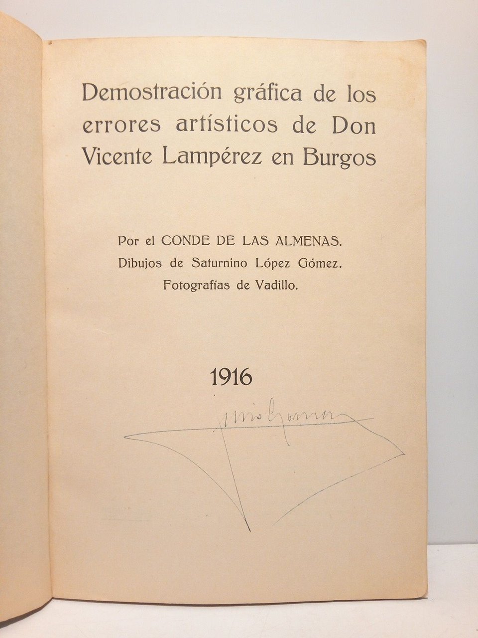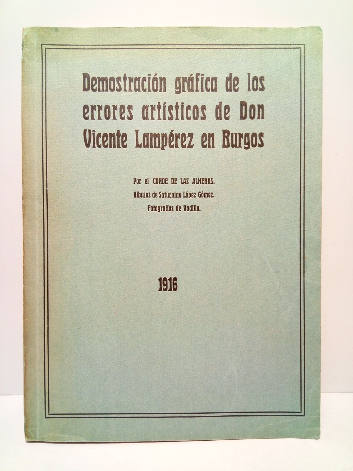 [PRIMERA EDICION Y UNICA].- [S.L., pero Madrid]: Imp. Blass y Cía., 1916.- 85 p. en numeración intermitente + [7 h.]: Profusión de láminas con fotos y dibujos artísticos; 4º mayor (27 x 19,5 cm); Cartulina Ed.- Interesantísimo trabajo de investigación, en el que el Conde de las Almenas hace una fuerte crítica a las obras de restauración dirigidas por el Sr. Vicente Lampérez, y realizadas en edificios y ornamentos artísticos de la Catedral y Casa del Cordón, en Burgos.* En la portada tiene una firma que debe ser de un antiguo propietário.¿"Julio Gómez"? y en la cabeza y pie del lomo pequeñas reparaciones. Por lo demás en muy buen estado, con el interior impecable. Don José María de Palacio y Abárzuza, III Conde de las Almenas, fue un ingeniero, gran coleccionista de Arte. Construyó en el pueblo madrileño de Torrelodones el llamado palacio del Canto del Pico, hoy en día muy abandonado a pesar de haber sido declarado por la R. A. de la Historia como Monumento Histórico Artístico en febrero de 1930. El palacio está situado en el lugar más alto del término municipal de Torrelodones, a 1011 metros de altitud sobre el nivel del mar. ARTE MEDIEVAL ESPAÑOL
