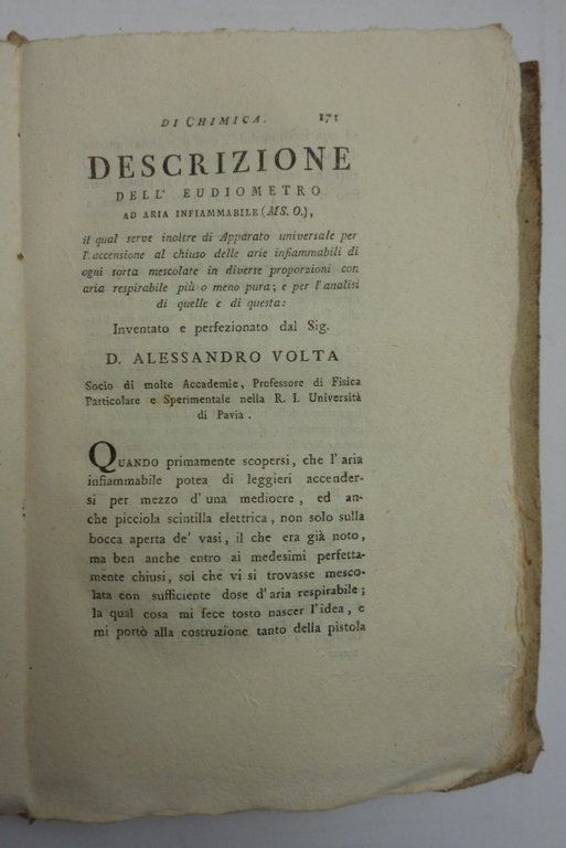 DESCRIZIONE DELL'EUDIOMETRO AD ARIA INFIAMMABILE. + SEGUITO DELLA DESCRIZIONE DELL’EUDIOMETRO AD ARIA INFIAMMABILE. (In Annali di Chimica, tomi 1 e 2, Pavia 1790-91).