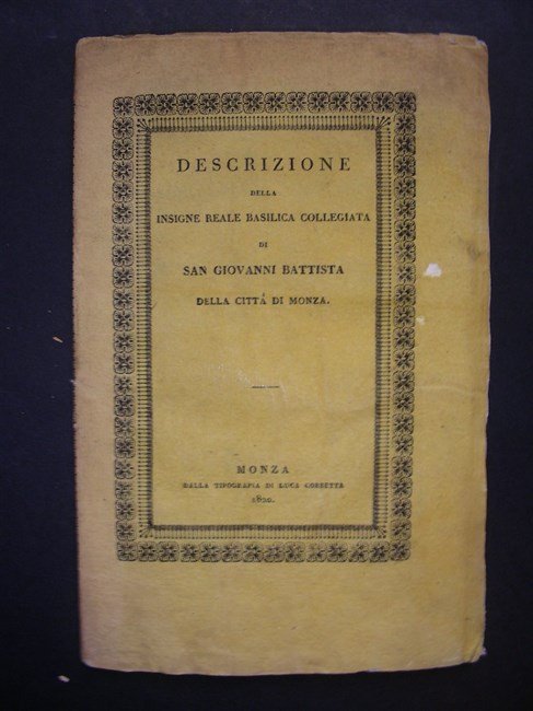 in-8, pp. 84, bross. edit. con bella cornice xilogr. ai piatti. Precisa descrizione di anonimo autore (di cui solo compare la sigla in calce alla prefazione) con note storiche sulla fondazione della basilica, le opere pittoriche esposte nelle cappelle, suppellettili liturgici, archivio, papiro gregoriano, l'Evangelario e la Corona della Regina Teodolinda, i tre Dittici Eburnei, etc. Lozzi 2944. Perfetto esempl. [324]