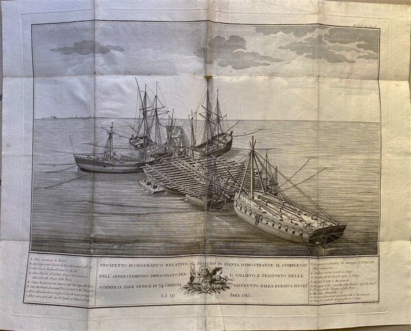 in-4, pp. XXXII, 90, (2), bella leg. m. perg. coeva con doppio tass. al d., piatti in carta dec. Splendido antip. inc. raff. scena d'interno con G. Zusto e allegoria di Venezia, sullo sfondo scena marina, finemente inc. in rame da Giuseppe Daniotto. L'opera racconta la complessa operazione di recupero della nave da guerra veneziana "la Fenice" dai fondali del canale Spignon nel Porto di Malamocco, affondata nel 1785 dopo l'alloggiamento eccezionale di 74 cannoni, e descrive i precedenti falliti tentativi di farla riemergere. Il tutto illustrato da 7 splendide tavv. in rame (mm.475x590), su doppia pagina e più volte ripiegate al fine, inc. da Daniotto su rilievi e disegni di Giuseppe Cason. Da pag.XIII a pag.XIX indispensabile dizionarietto dei termini nautici per l'interpretazione delle tavole. Rara ediz. orig. Riccardi I, 407: "E' opera interessantissima per gli studiosi della meccanica applicata alla nautica". Cicogna 1458. Morazzoni 263. Ex libris. Alcuni calcoli matematici mss al front. di calligrafia coeva. Ottimo esempl. su carta forte. [290]