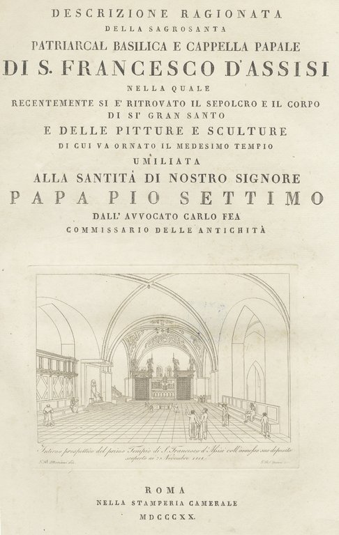 Descrizione ragionata della sacrosanta patriarcal Basilica e cappella papale di S.Francesco d’Assisi nella quale recentemente si è ritrovato il sepolcro ed il corpo di sì gran santo e delle Pitture e Sculture di cui va ornato il medesimo tempio.Umiliata a Pio VII....