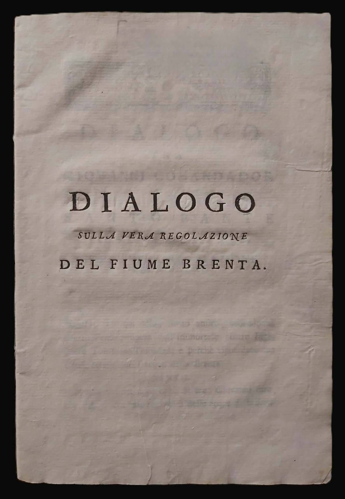 in-16, pp. XXXIV, leg. carta color. coeva con impress. xilogr. ai piatti. Curiosa discussione sulla regolazione delle acque in forma di dialogo tra Giovanni Comandador e Santo Fante del Magistrato alle acque i quali dimostrano, in contrasto da come umilmente si presentano, di essere profondi conoscitori del problema, citando dotte argomentazioni e soluzioni di celebri ingegneri idraulici. Ediz. orig. Melzi I, p.293 per la seconda edizione con aggiunta. Raro.