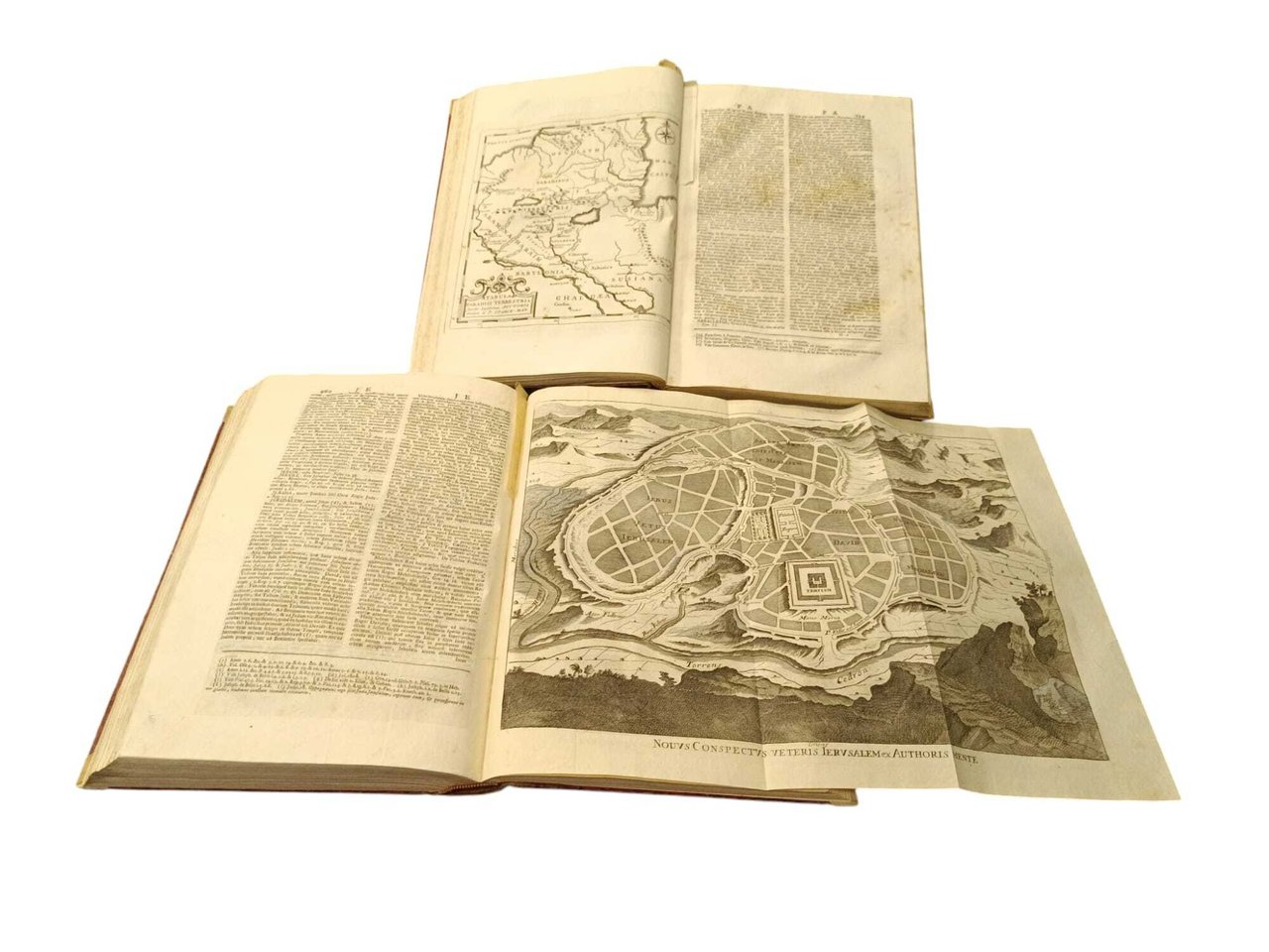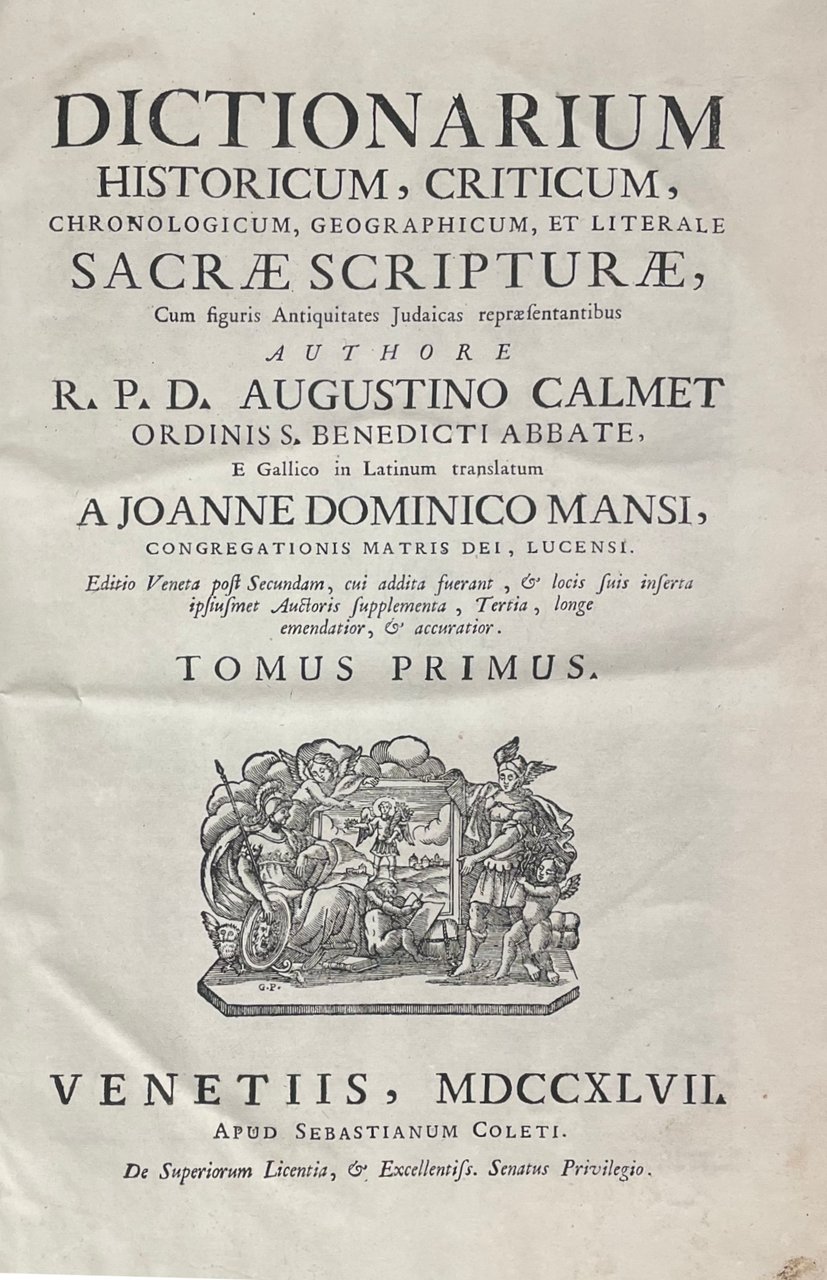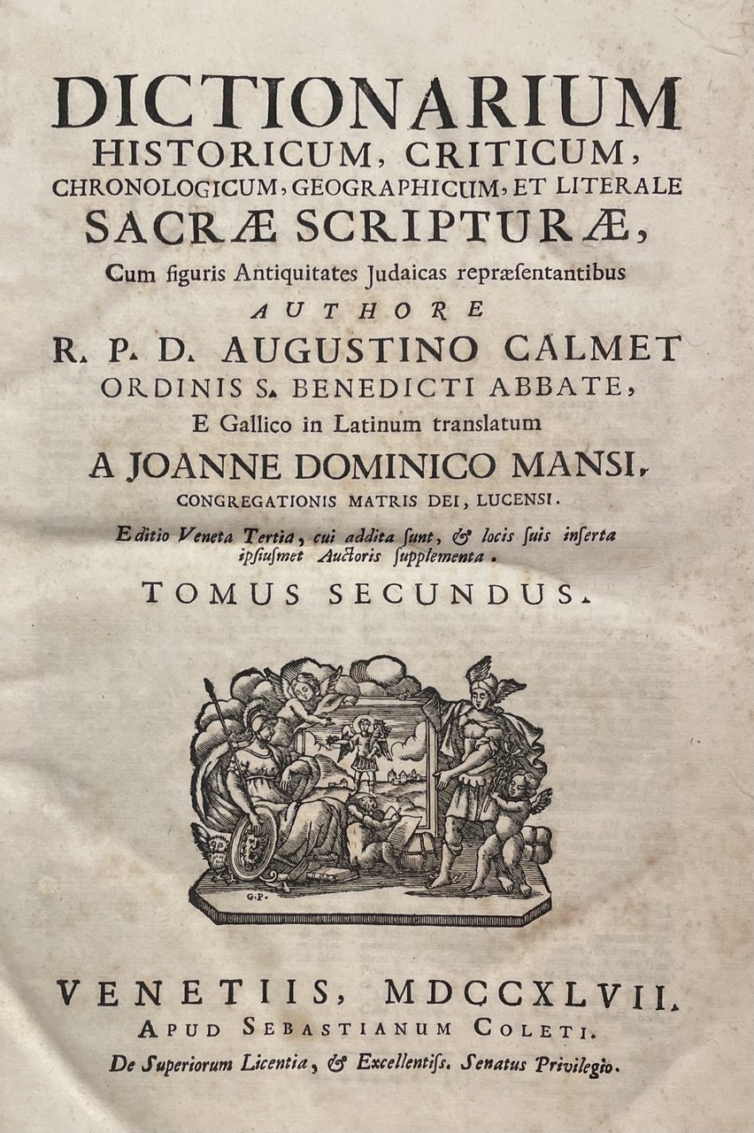 "Editio Veneta post Secundam, cui addita fuerant, et locis suis inserta ipsiusmet Auctoris supplementa, Tertia, longe emendatior, et accuratior". Opera enciclopedica che si propone a guisa di guida erudita per la comprensione delle Sacre Scritture, organizzata in forma di dizionario. Contiene informazioni dettagliate di carattere storico, critico, cronologico, geografico e letterale, offrendo spiegazioni approfondite su personaggi, luoghi, eventi e concetti biblici. L'opera include illustrazioni che rappresentano le antichità e i costumi giudaici, fornendo una visione visiva e contestuale del mondo biblico. 26 tavole incise a piena pagina, alcune ripiegate. Le incisioni rappresentano carte geografiche della Terra Promessa, oggetti sacri ebraici, numismatica, la pianta di Gerusalemme e del Paradiso terrestre, alberi genealogici, strumenti musicali, abiti sacerdotali... in folio leg. mezza pelle con piatti marmorizzati, tassello con titolo e fregi in oro al dorso 2 voll.: pp. 12, 144, 616 (10 carte) - pp. 676 (19 carte) Buono (Good) Buon es., con trascurabili segni del tempo.