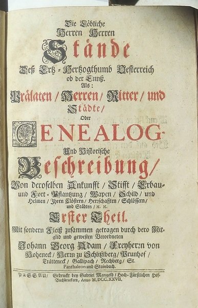 Die Löbliche Herren Stände Deß Ertz-Hertzogthumb Oesterreich ob der Ennß. Als: Prälaten, Herren, Ritter, und Städte, oder Genealog- Und Historische Beschreibung von deroselben Ankunft, Stifft, Erbau- und Fort-Pflanzung, Wapen, Schild, und Helmen, Ihren Clöstern, Herschafften, Schlössern, und Städten.